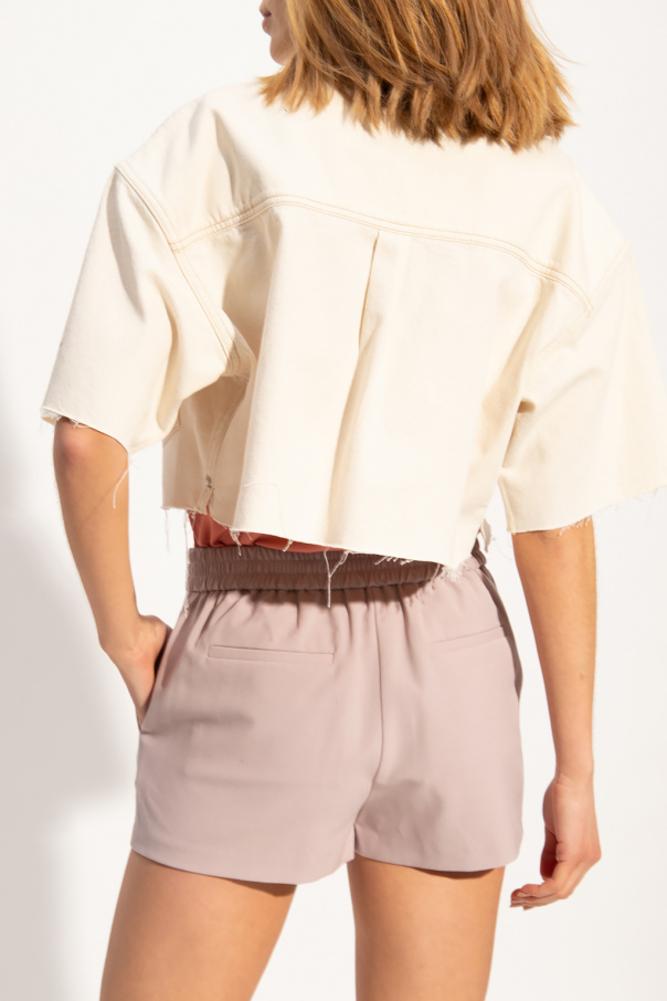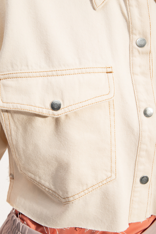 Cream ‘Patty’ shirt with short sleeves from AllSaints. This cropped garment is complete with snap fastenings, two snap-fastened flap pockets and raw cut edges.