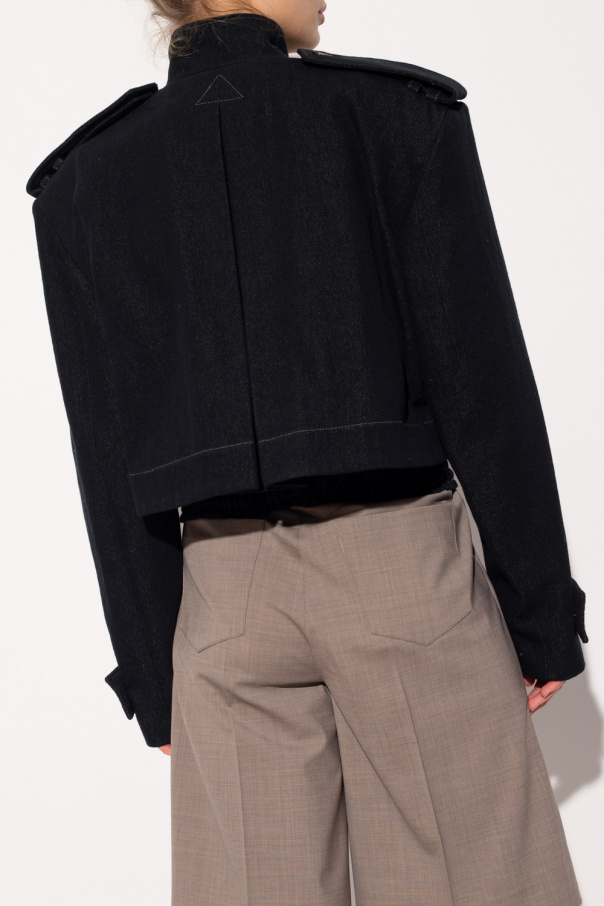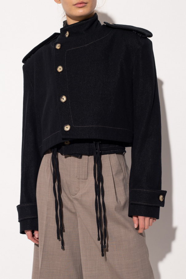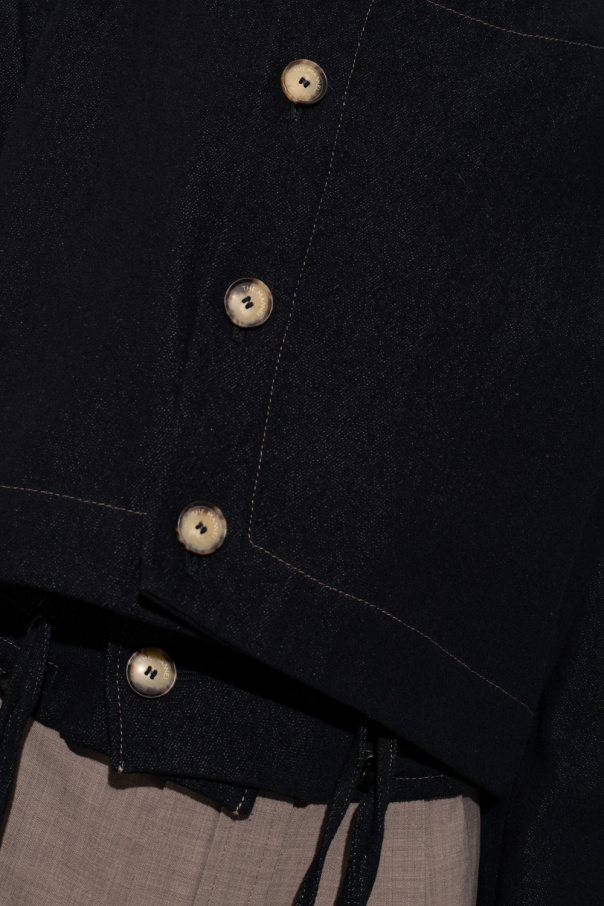 Black ‘Aqaba’ denim jacket from The Mannei. Crafted from cotton, this style features button fastenings, a standing collar, distinctive seams, long sleeves and an elasticated bottom hem with drawcords.