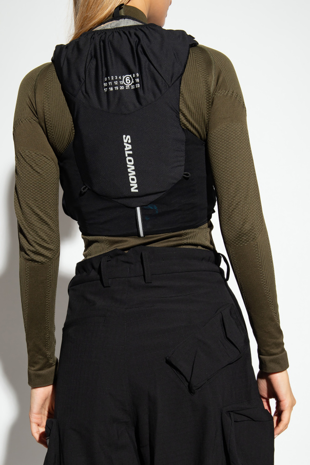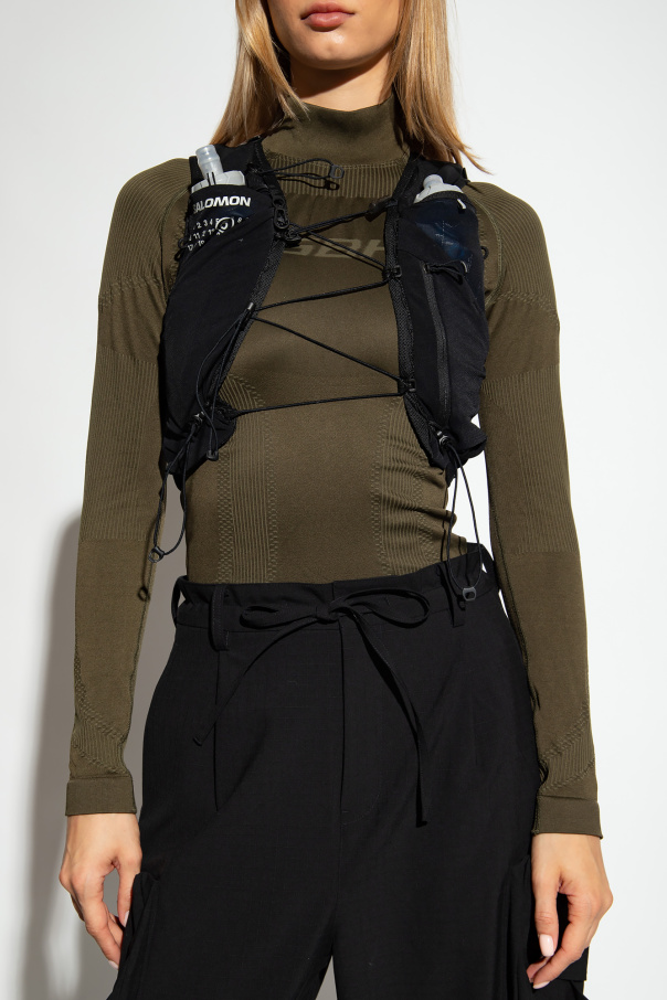Black running vest from MM6 Maison Margiela x Salomon. Crafted from technical fabric and sports mesh, this garment features lacing on the front, a white logo embroidery, five front pockets – two with removable, flexible 500 ml water bottles, as well as a back pocket with a removable water pouch.