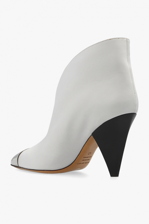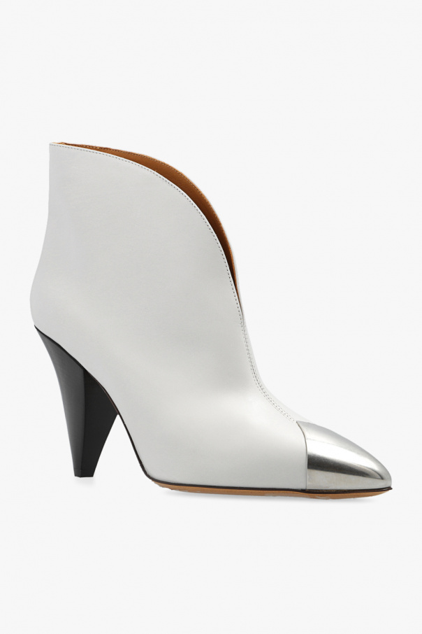 White ‘Adsie’ heeled ankle boots from Isabel Marant. Made from calf leather with a slip-on silhouette, this model features a pointed toe silhouette with cutout detailing, silver-tone metal hardware on the toe cap, a cone-shaped heel and a beige leather sole.