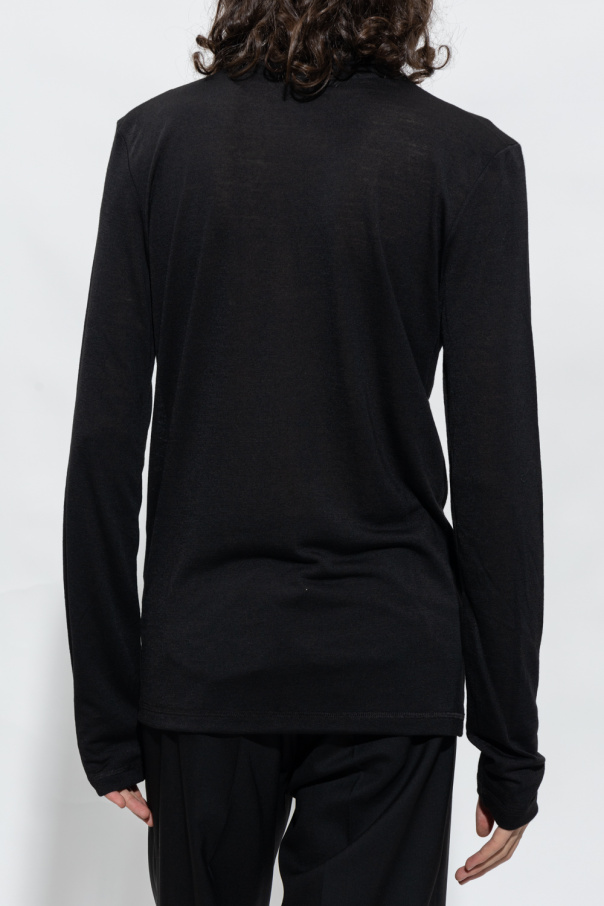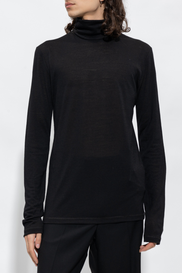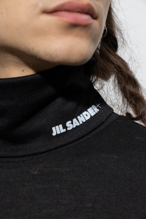 Black turtleneck sweater from Jil Sander+. Crafted in part from virgin wool, this style features long sleeves and a snug collar printed with a white logo.