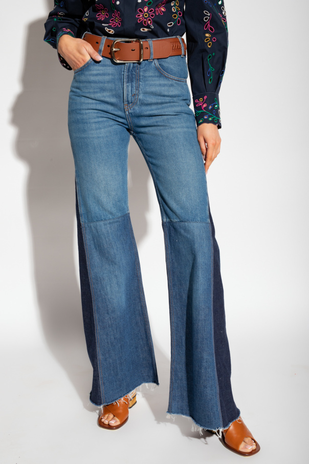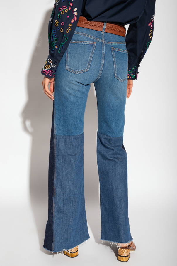 Blue and navy jeans from Chloé. Crafted from contrasting fabrics, this pair features a zip and button closure, three front pockets, two back pockets and flared legs with raw cut edges.