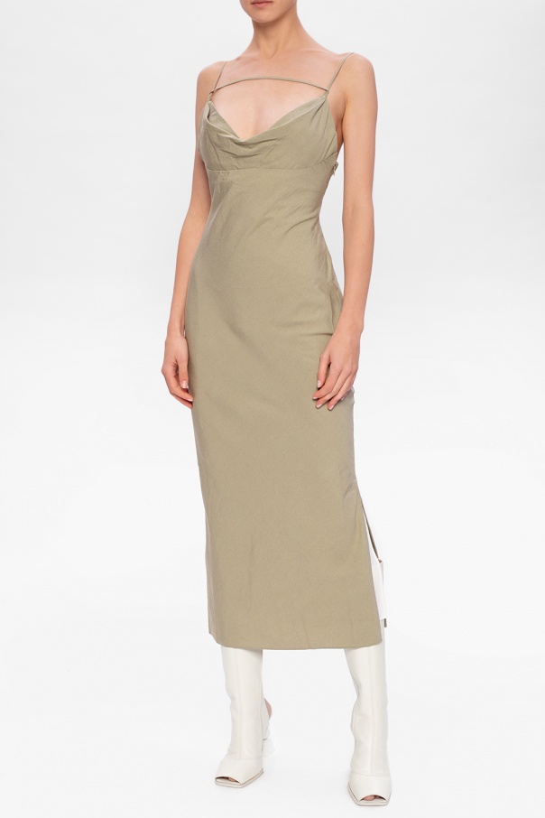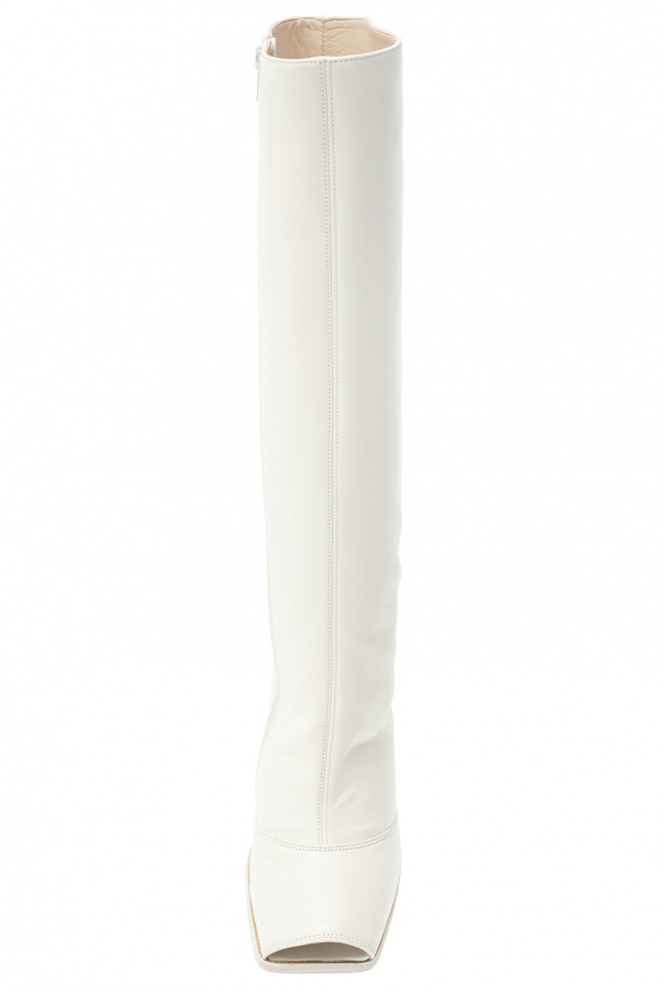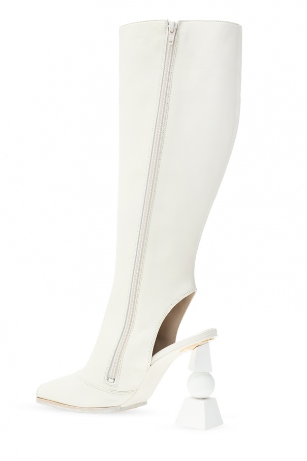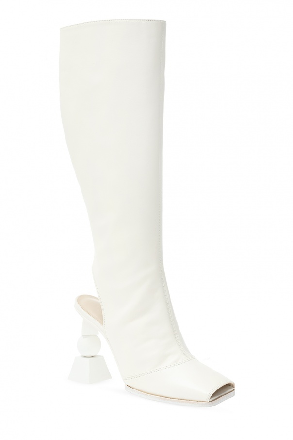Cream ‘Olive’ heeled boots from Jacquemus. Crafted from leather, this item features a side zip fastening, open back and toe, decorative heel in white and a beige leather sole.