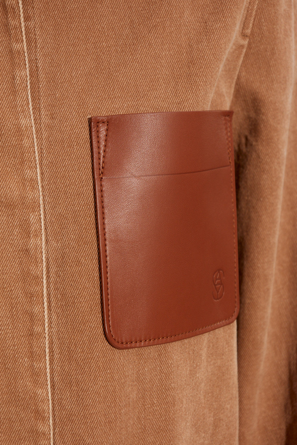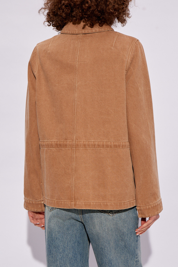 Brown denim jacket from Yves Salomon. Fastened with snap buttons with a concealed placket, this garment features two snap-fastened pockets, a logo-embossed leather pocket, drawstring at the back and long sleeves with snap-fastened cuffs.