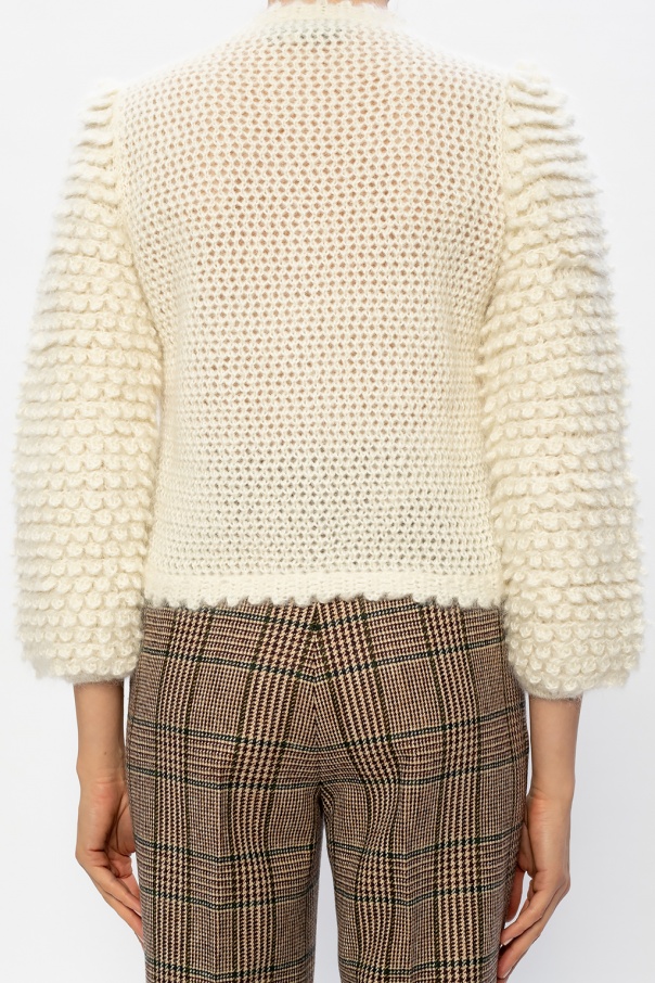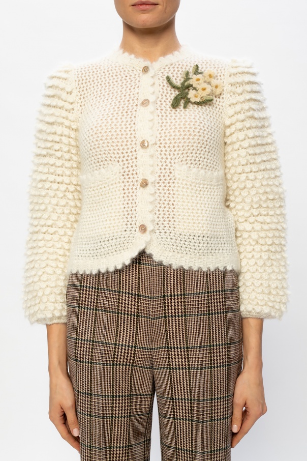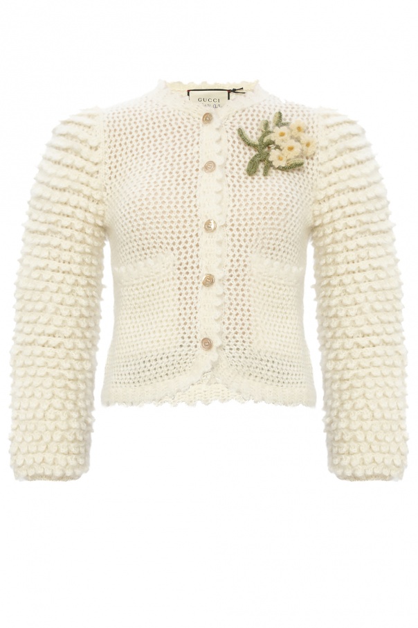 Cream knitted cardigan from Gucci. Fastened with buttons, this long sleeve design features a floral motif brooch and two slip pockets.