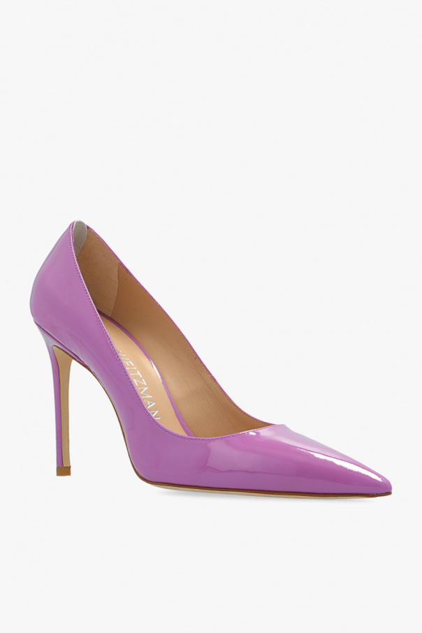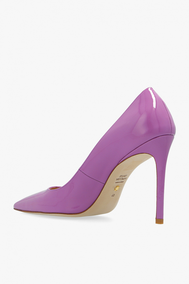 Purple ‘Stuart’ stiletto pumps from Stuart Weitzman. Crafted from patent leather, this model features a tapered toe and a cream leather sole.