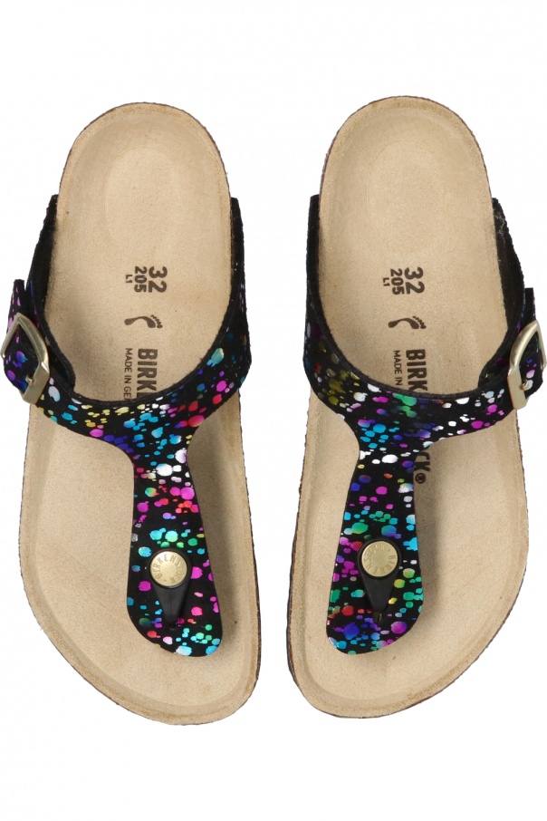 Black ‘Gizeh Kids BS’ slides from Birkenstock Kids. Illustrated with a colourful pattern, this pair sits on a black rubber sole and employs a gold-tone buckle fastening.