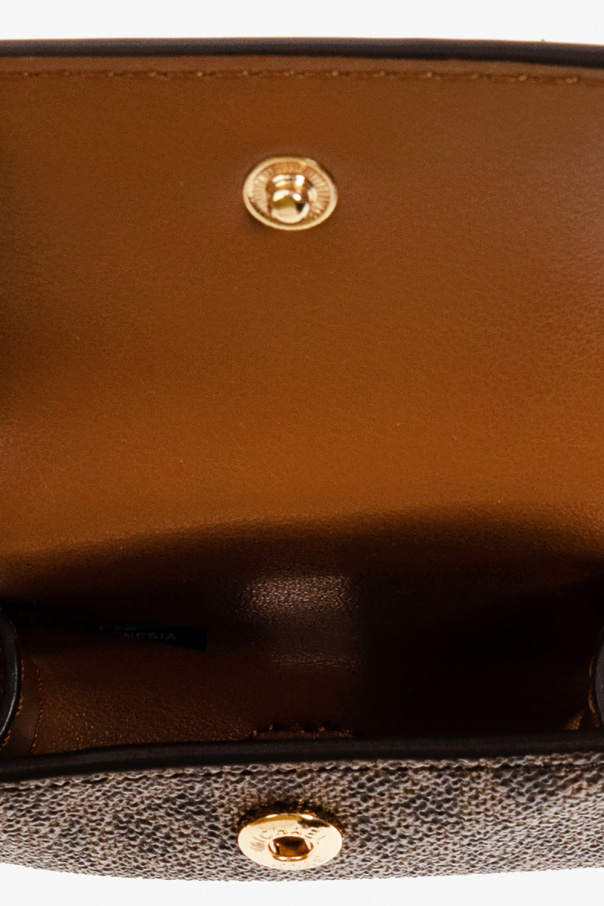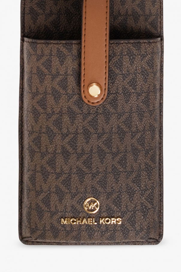 Brown ‘Devon’ phone pouch from Michael Michael Kors. Fastened with snaps, this model features a monogram, metal logo appliqué, eight card slots at the back, detachable shoulder strap and gold-tone metal hardware. Comes with an AirPods case.