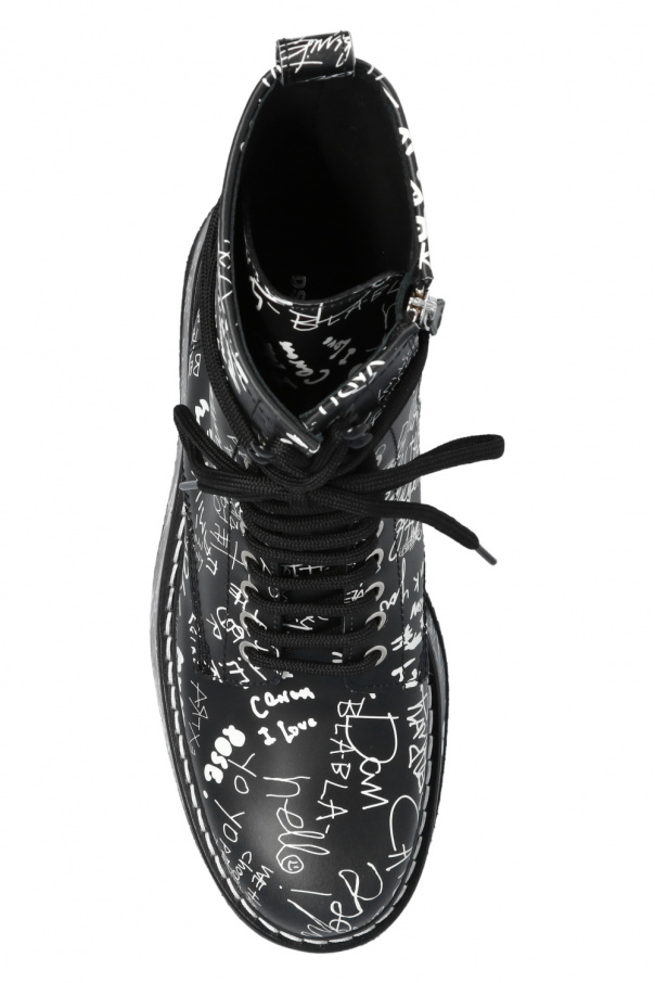 Black ‘Scribbles’ wedge ankle boots from Dsquared2. Crafted from leather, this lace-up model features a side zip closure, a white graphic print, a rear fabric insert with a tactile white logo and a black rubber sole at the base.