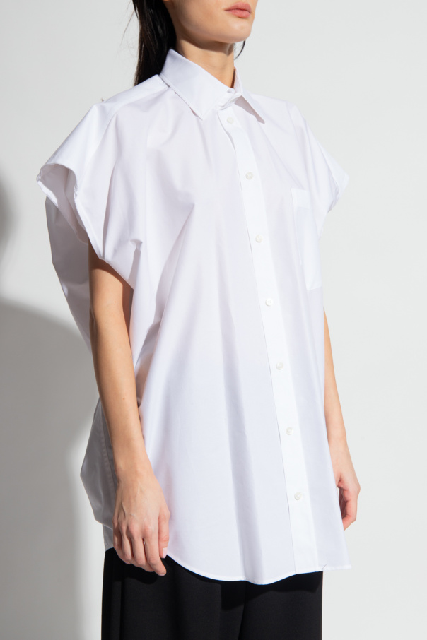 White sleeveless shirt from Balenciaga. Crafted from cotton, this oversize design is complete with buttons, front pocket and raw-trimmed edges at the shoulders.
