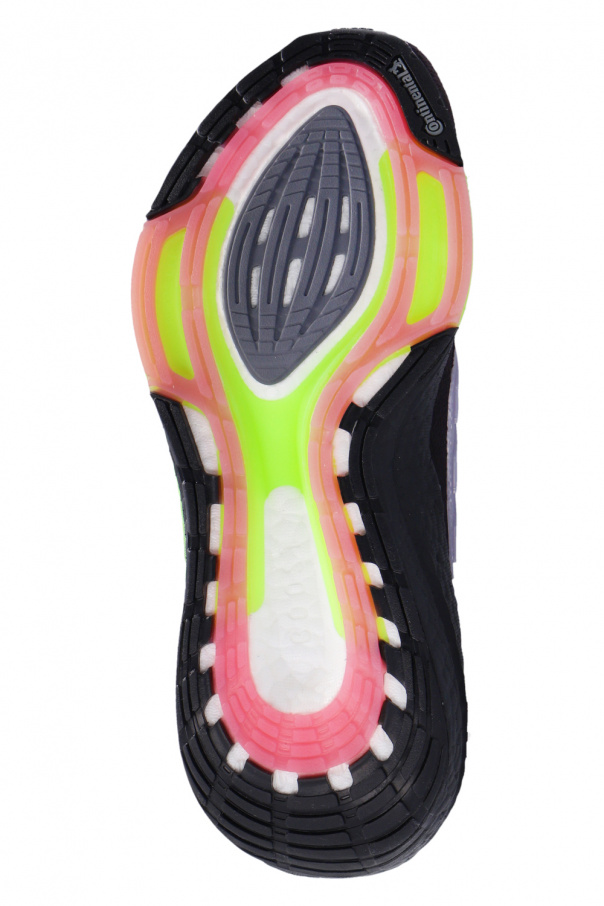 Black and pink ‘UltraBOOST 21’ sneakers from ADIDAS Performance, the ‘Primeblue’ line. Featuring a Primeknit+ upper, this lace-up model employs a logo appliqué on the tongue, the iconic three stripes in light purple on the sides and a black Stretchweb Continental™ rubber sole with 6% more Boost capsules and the new Torsion System, which provides a 15% increase in forefoot bending stiffness for a more responsive run. Primeblue is a performance fabric made with Parley Ocean Plastic, which is created from recycled plastic waste intercepted from beaches and coastal communities before it reaches the oceans. Products made of Primeblue contain a minimum of 40% recycled material in total.