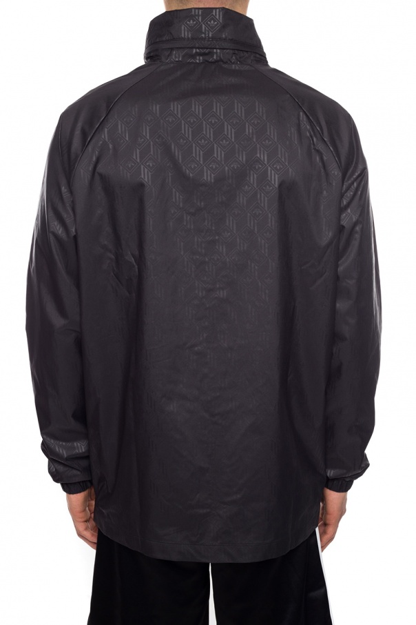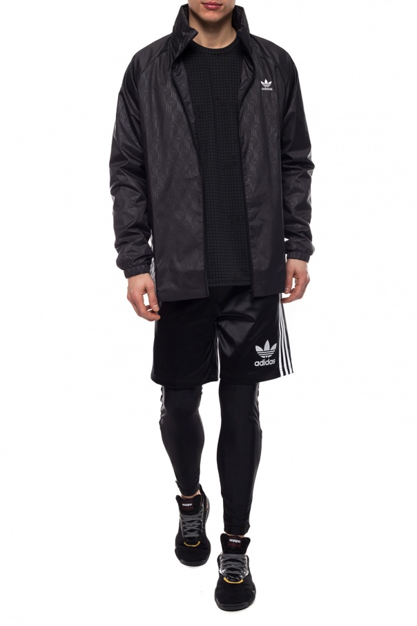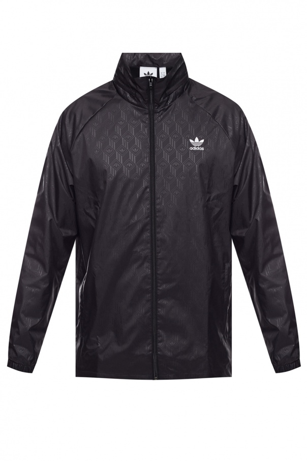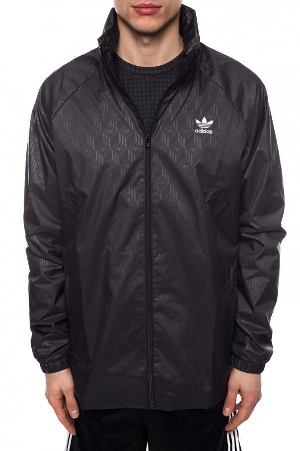 Black windbreaker from ADIDAS Originals. Fastened via zip. Embellished with pattern with logo and embroidered white trefoil logo. Features 2 slip frontal pockets, elasticated cuffs and concealed hood.