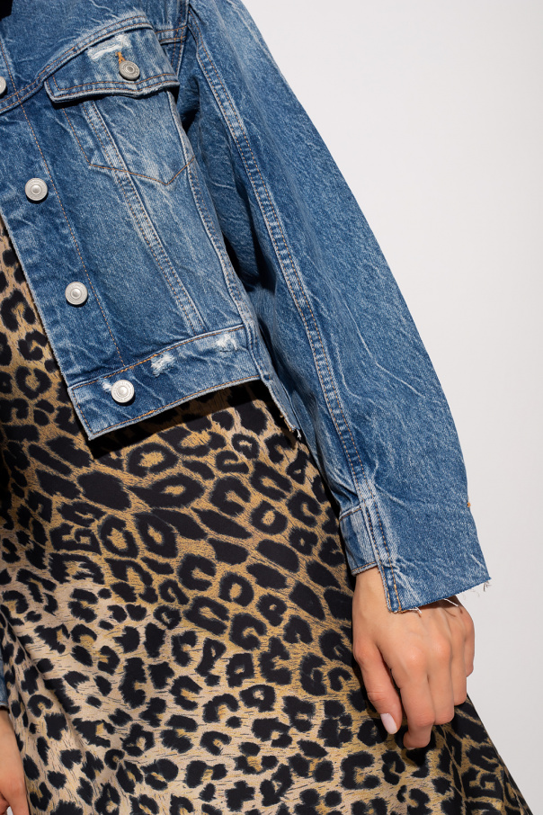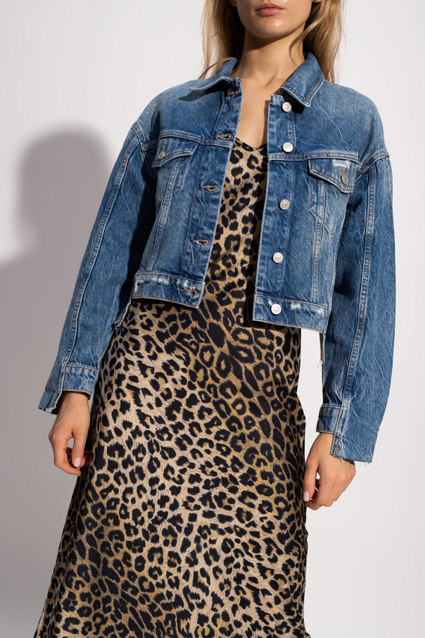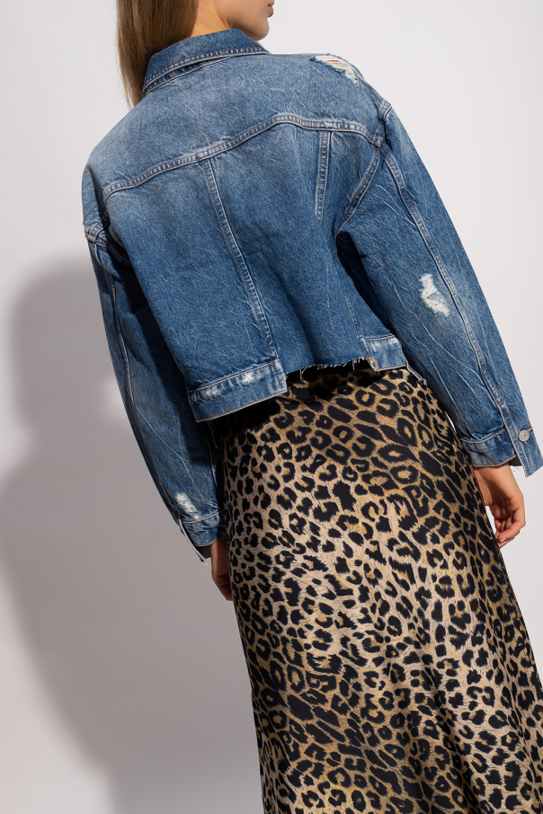 Blue ‘Beth’ cropped denim jacket from AllSaints. Crafted from a sustainable Tencel™ lyocell, this style fastens via buttons and showcases asymmetrical, raw hems on the bottom and cuffs, distressed effects and two chest pockets with buttons.