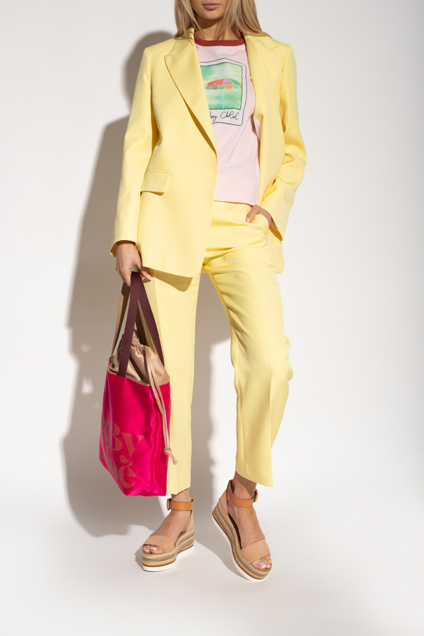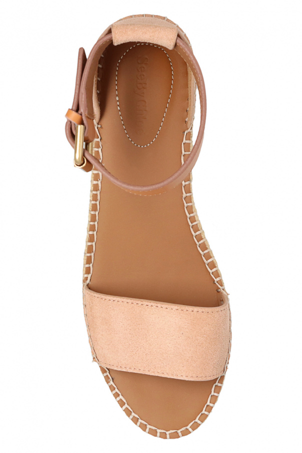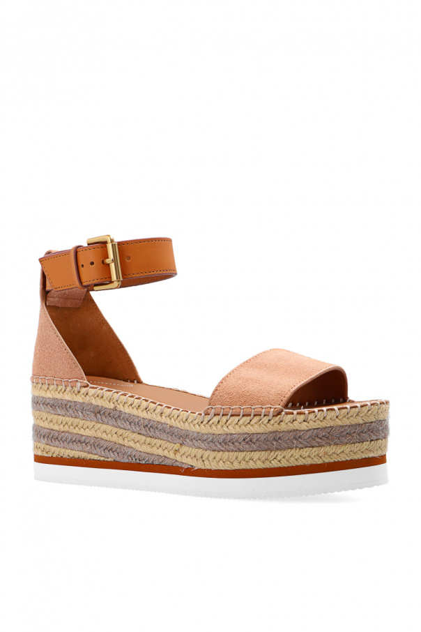 Beige ‘Glyn’ platform sandals from See By Chloé. Made of suede, this pair features brown leather ankle strap with a buckle and rubber sole trimmed with jute in white, brown and beige.