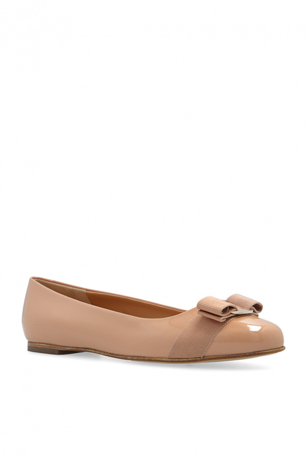 Beige ‘Varina’ ballet flats from Salvatore Ferragamo. Crafted from patent calf leather, this model sits on a beige leather sole and showcases the brand's signature bow with a logo on the front.