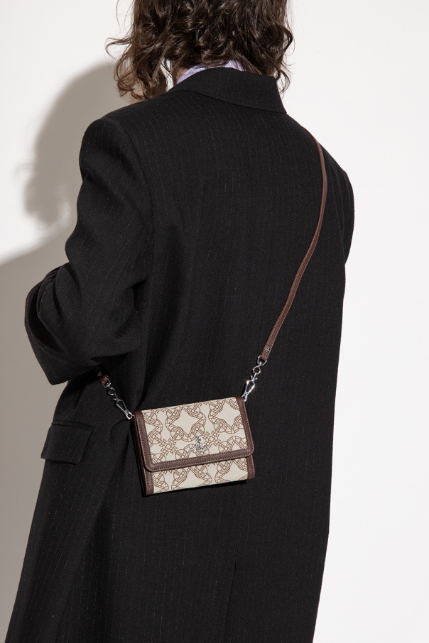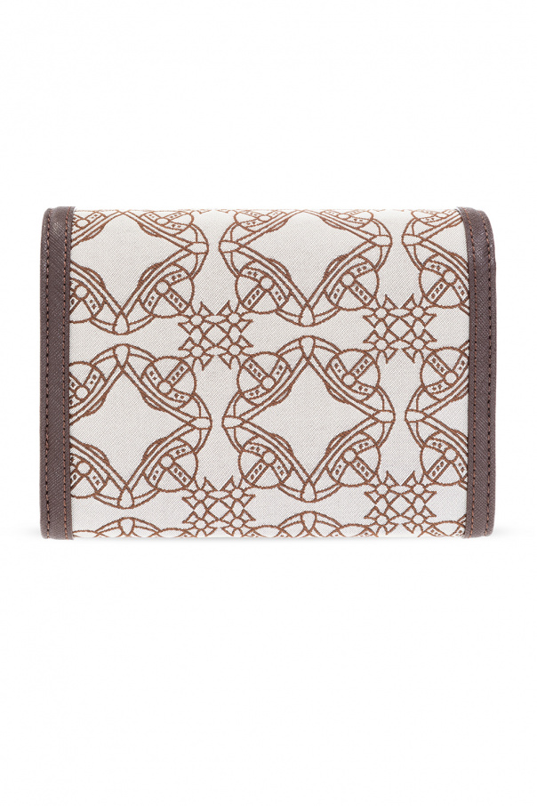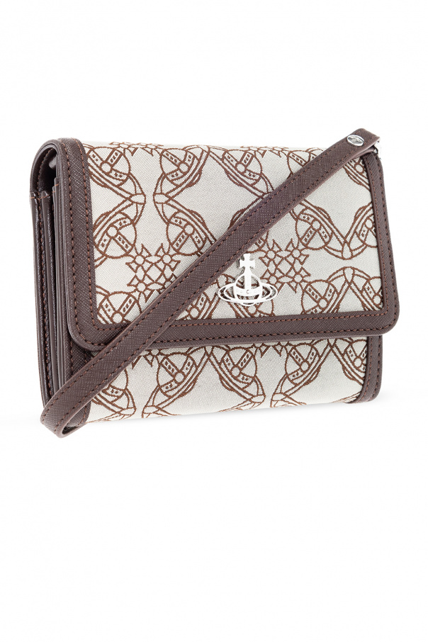 Cream and brown ‘Logo’ wallet from Vivienne Westwood. Crafted from recycled materials and vegan leather, this design secures with a press stud and features an application, an embroidered logo, a shoulder strap, silver-tone metal hardware and two compartments, eight card slots and one zip pocket inside.