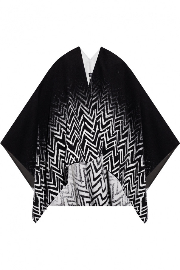 Black and white poncho from Emporio Armani. Crafted from a wool and cashmere blend, this item showcases an embroidered graphic pattern.