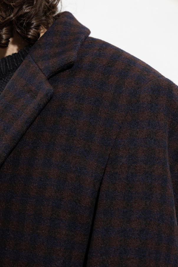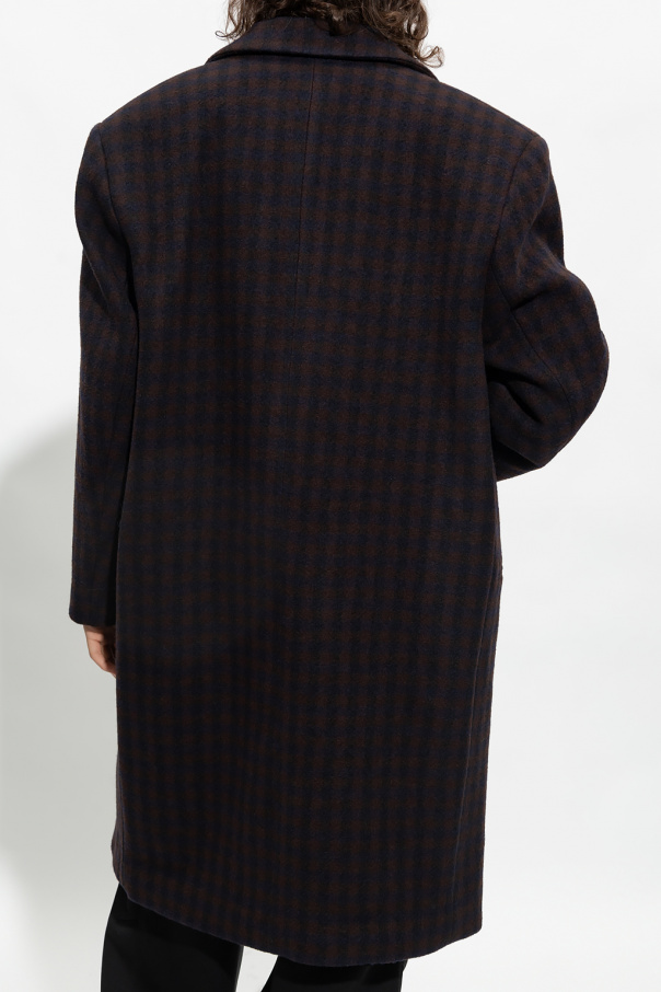 Brown and navy coat with notch lapels, buttons, two front pockets and long sleeves from Lemaire. Made of wool.