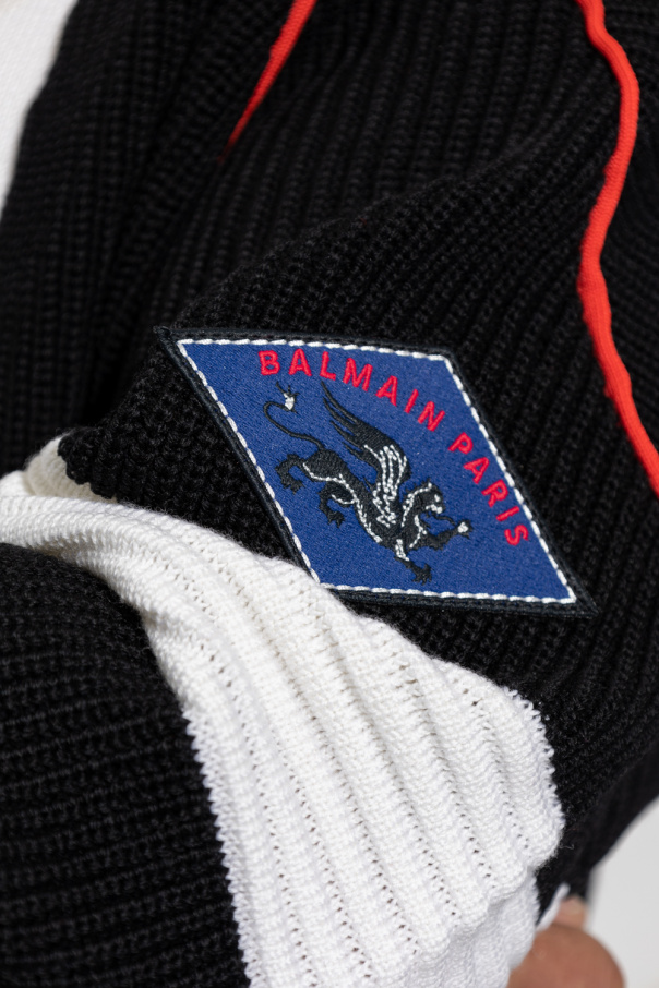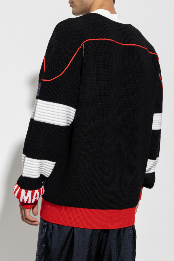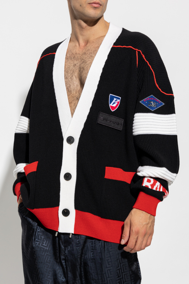 Black, red and cream oversize cardigan from Balmain, the ‘B-Sporty Boxy’ collection. Crafted from wool with various knits, this garment is complete with button fastenings, patches on the front and sleeve, including one fastened with velcro, as well as two slip pockets and ribbed trims at the hem and cuffs.