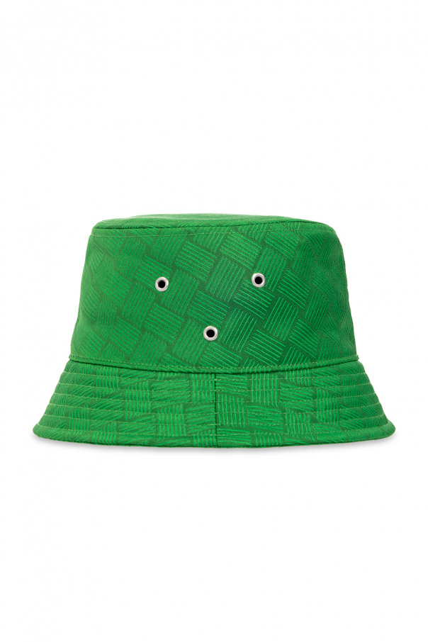 Green bucket hat from Bottega Veneta. Made of technical fabric embroidered with the iconic Intreccio pattern.
