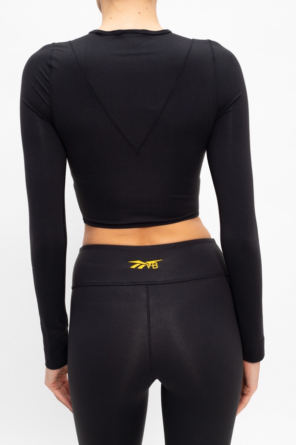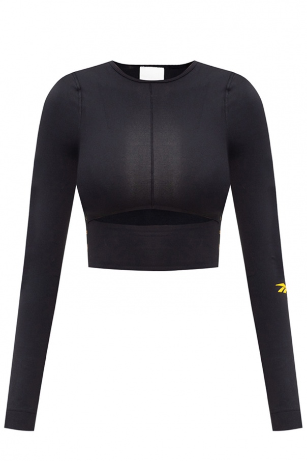 Black top from Reebok x Victoria Beckham. Decorated with a yellow logo print, this design has a round neck, long sleeves and a decorative cut-out on the front.