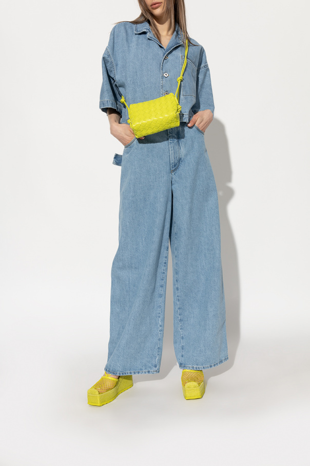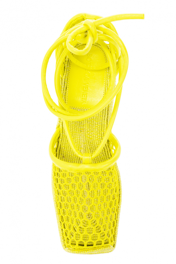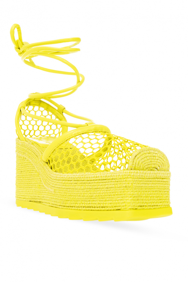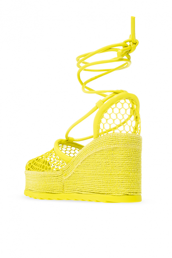 Light green ‘Strech’ platform shoes from Bottega Veneta. Crafted from leather and cotton mesh, this pair features ankle ties, decorative jute trims and light green rubber sole.