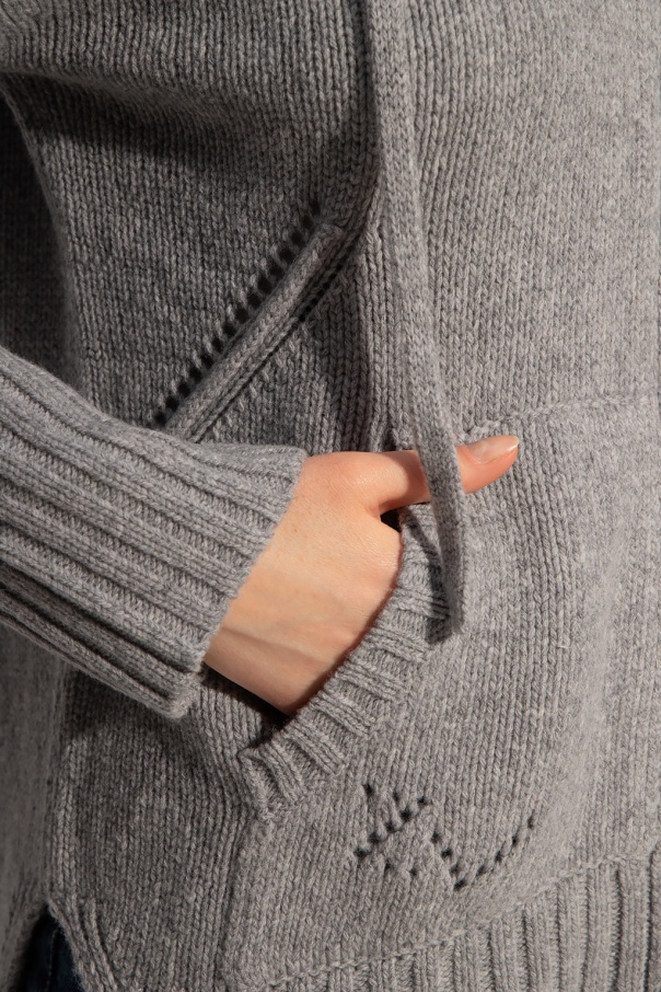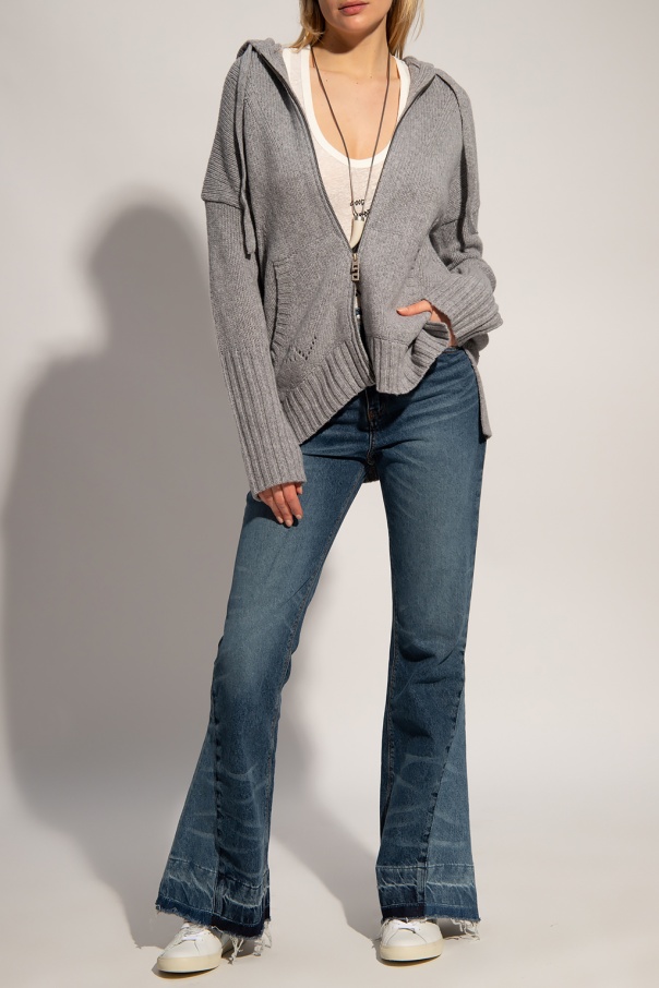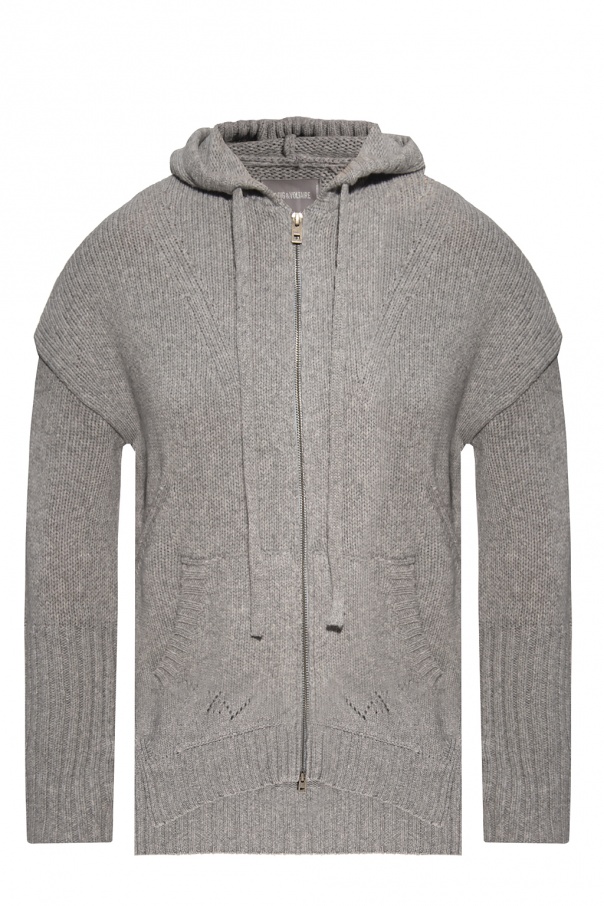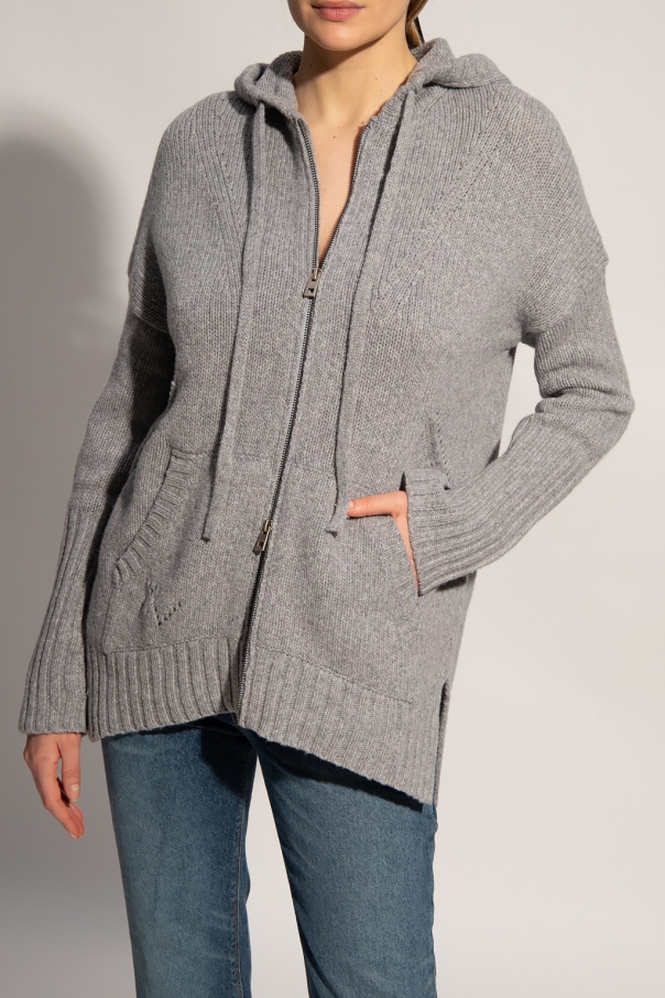 Grey hooded sweater from Zadig & Voltaire. Knitted from wool, this jumper fastens via a two-way zip and features two pockets on the front, slits on the sides and blue embroidery on the back.