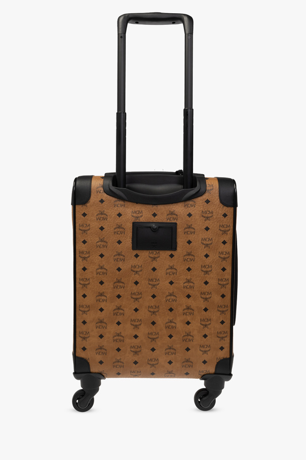 Brown and black suitcase with rotary wheels from MCM. Crafted from the brand's signature ‘Visetos’ canvas with a black monogram, this design secures with a two-way zipper and features a logo application accompanied with a zip pocket on the front, two half-round handles, one telescopic handle, black metal hardware and two separate compartments with two-way zippers and two zip pockets inside.