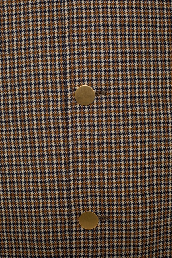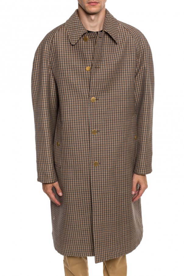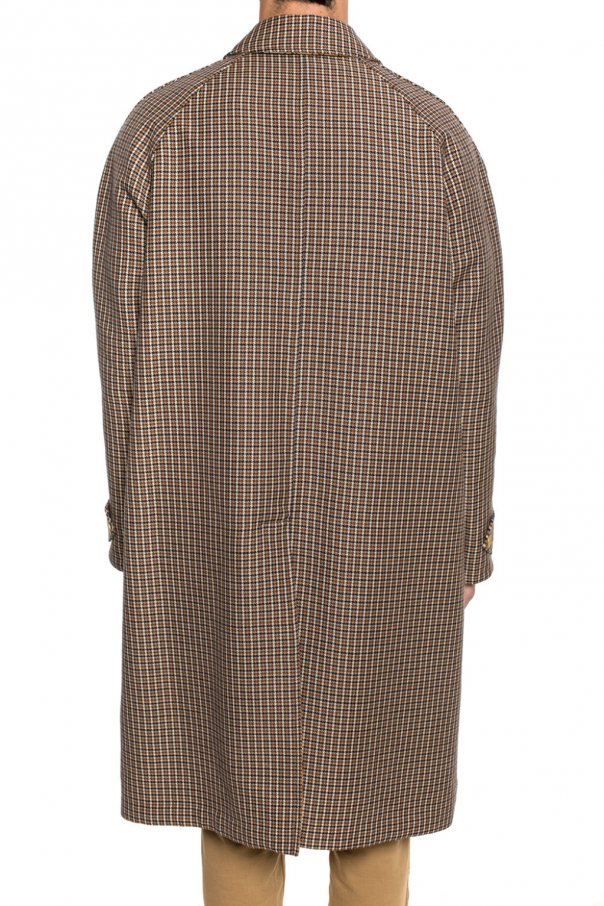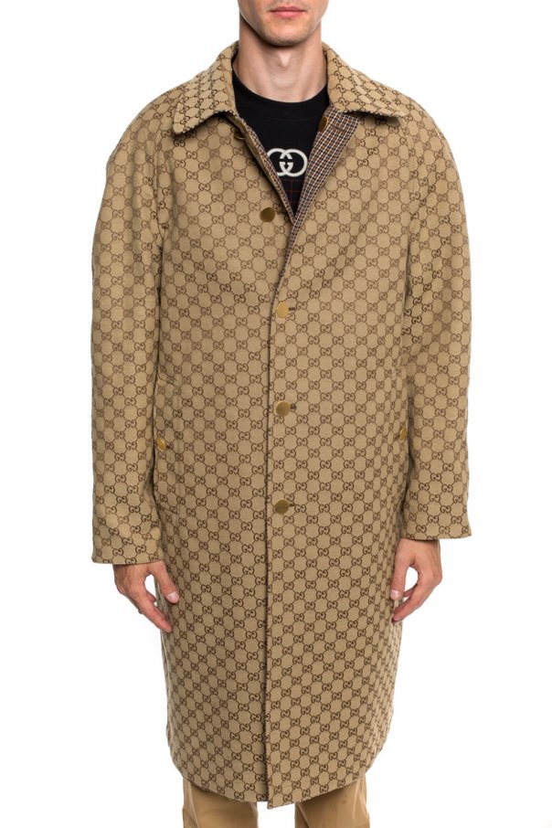 Beige reversible coat from Gucci. Button fastening. 2 buttoned pockets on the front. Single vent on the back. One side has woven navy blue and brown pattern throughout. Reversible side has a GG jacquard pattern.