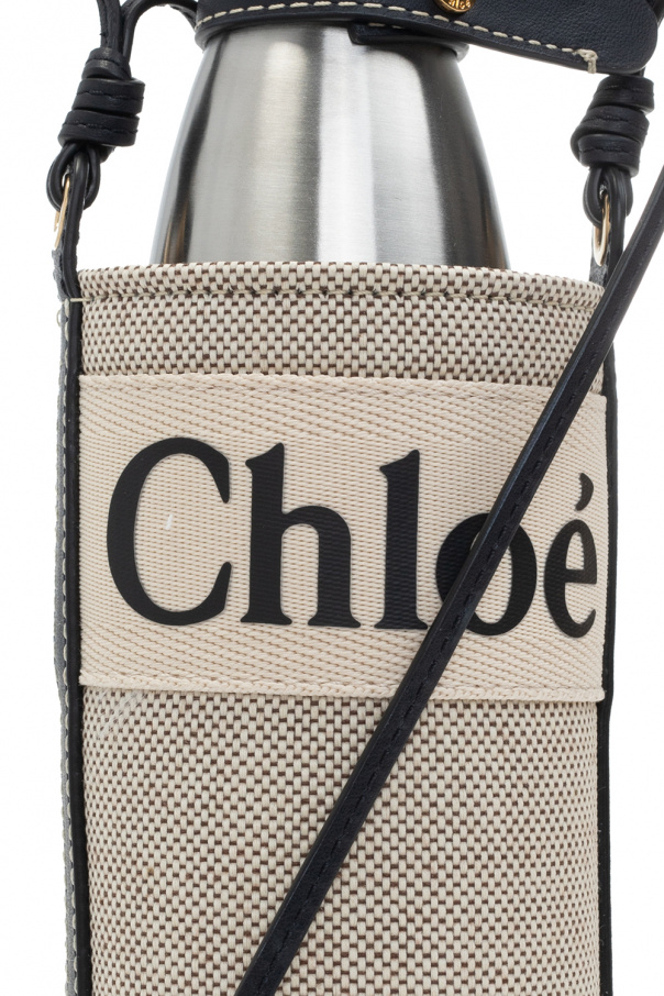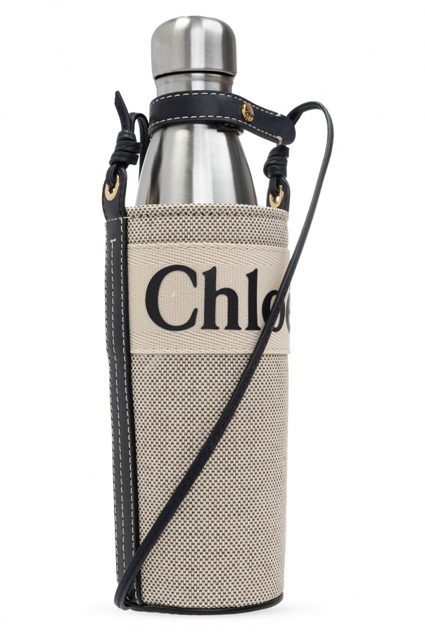 Beige and black bottle holder from Chloé. Crafted from canvas trimmed with black calf leather, this design features a logo print and an adjustable shoulder strap. Comes with a silver-tone bottle made of stainless steel.