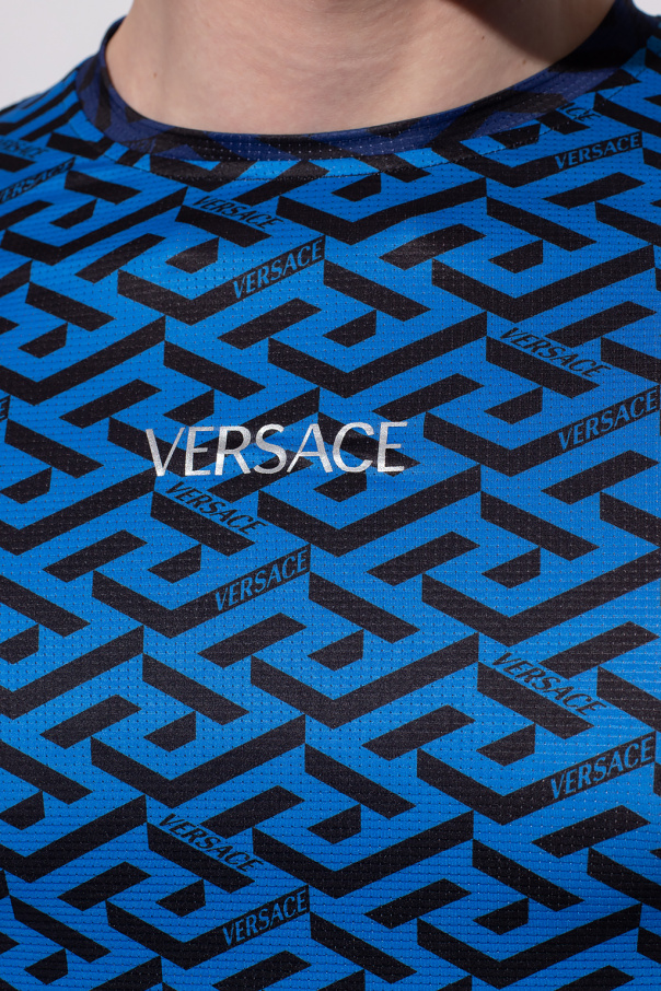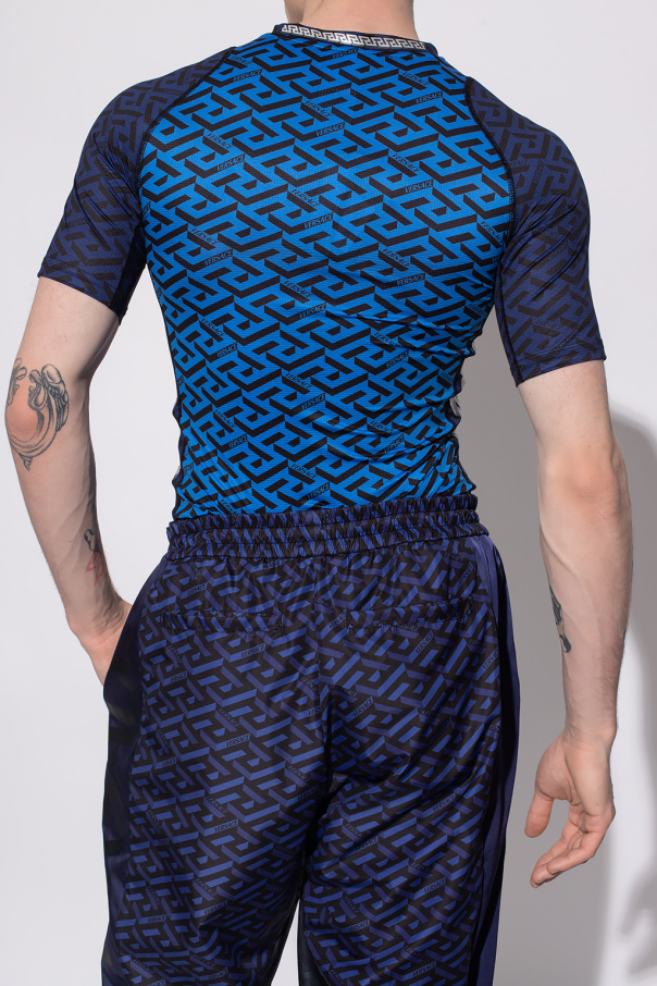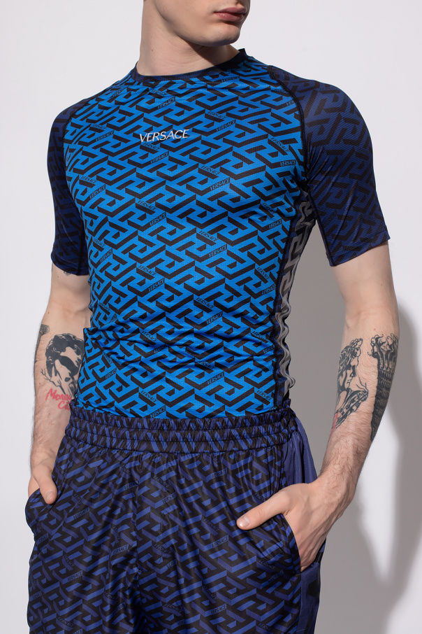 Blue, black and navy crewneck training T-shirt from Versace. This short sleeve design features the label’s signature La Greca motif, a logo print and contrasting Greca side stripes.