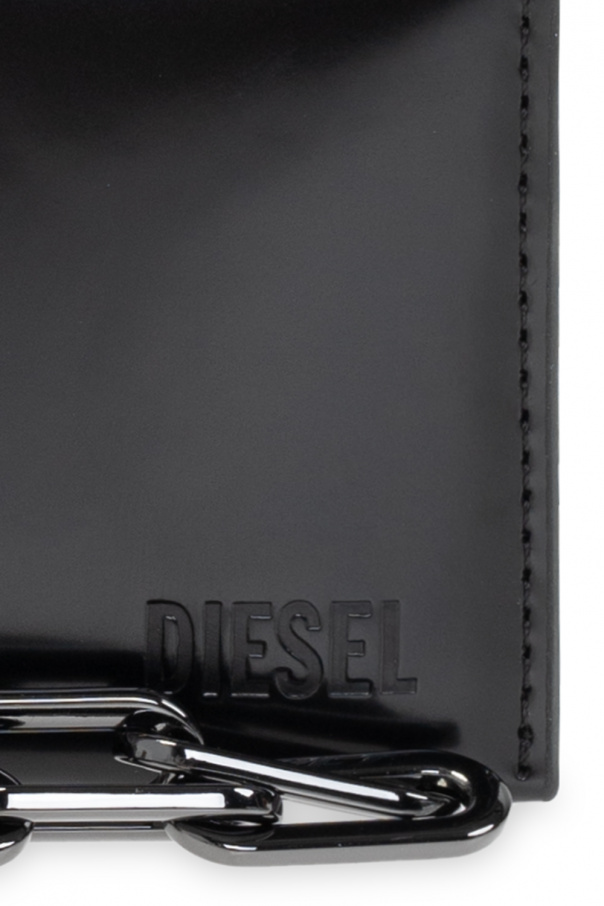 Black bifold card holder from Diesel. Made of leather, this design features an embossed logo, keyring with a chain, red and black lining and six internal card slots.