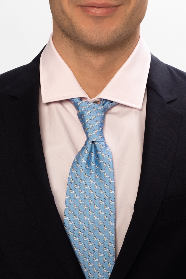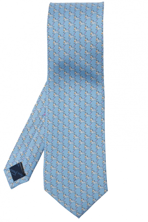 Blue tie from Salvatore Ferragamo. Woven from silk, this item is adorned with a colourful animal pattern.