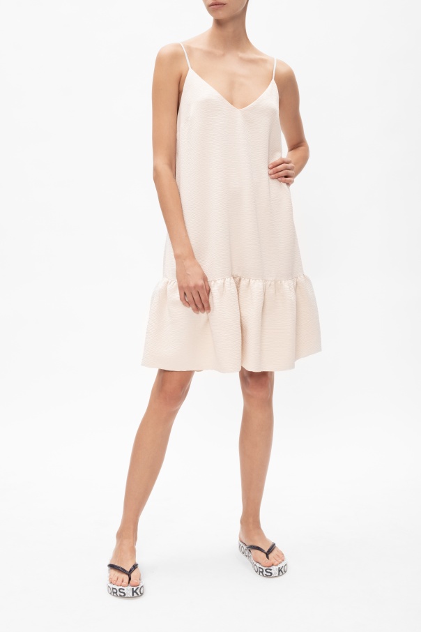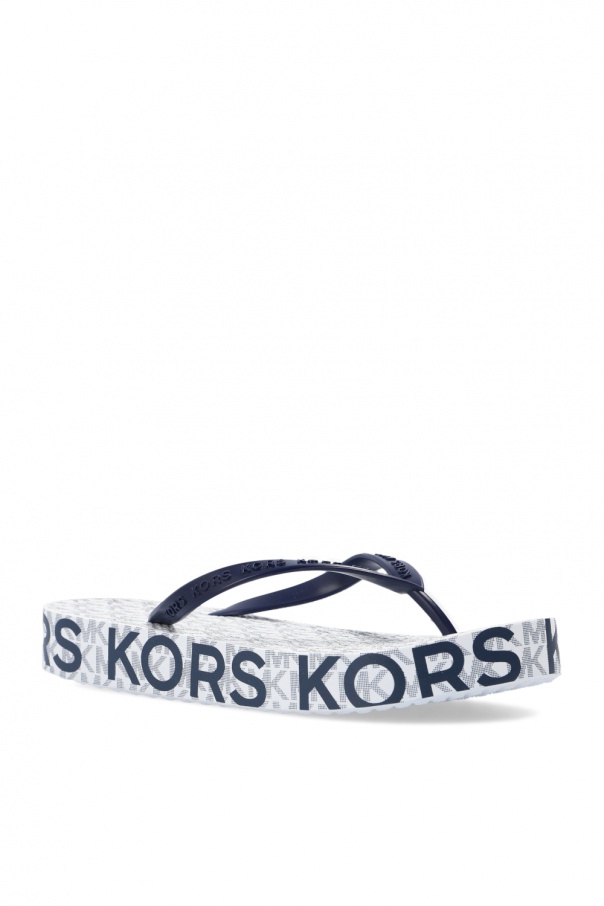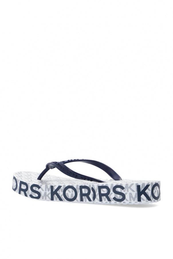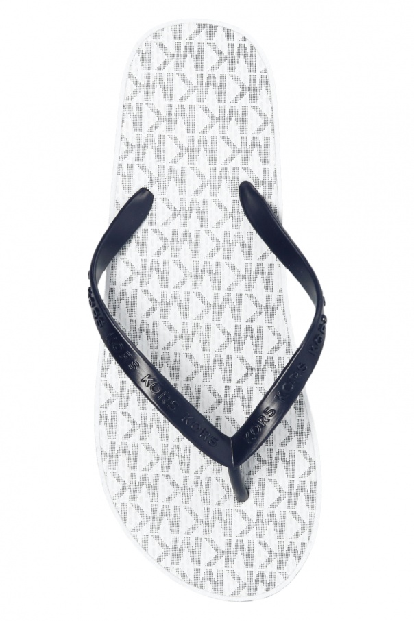 White and navy flip-flops from Michael Kors. Set on a white platform sole in rubber, this pair has embossed the designer's branding.