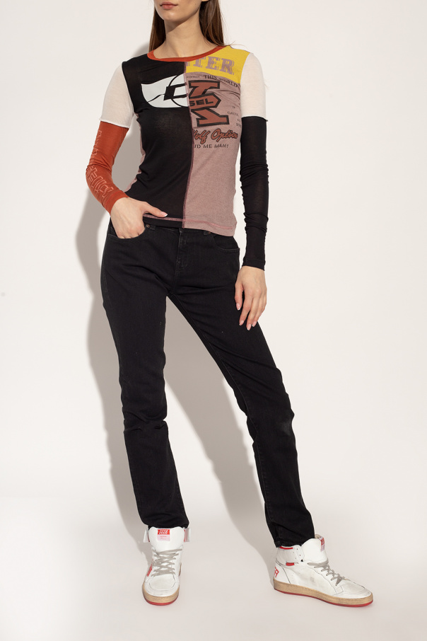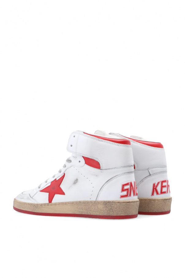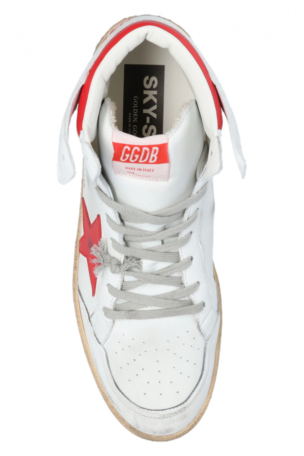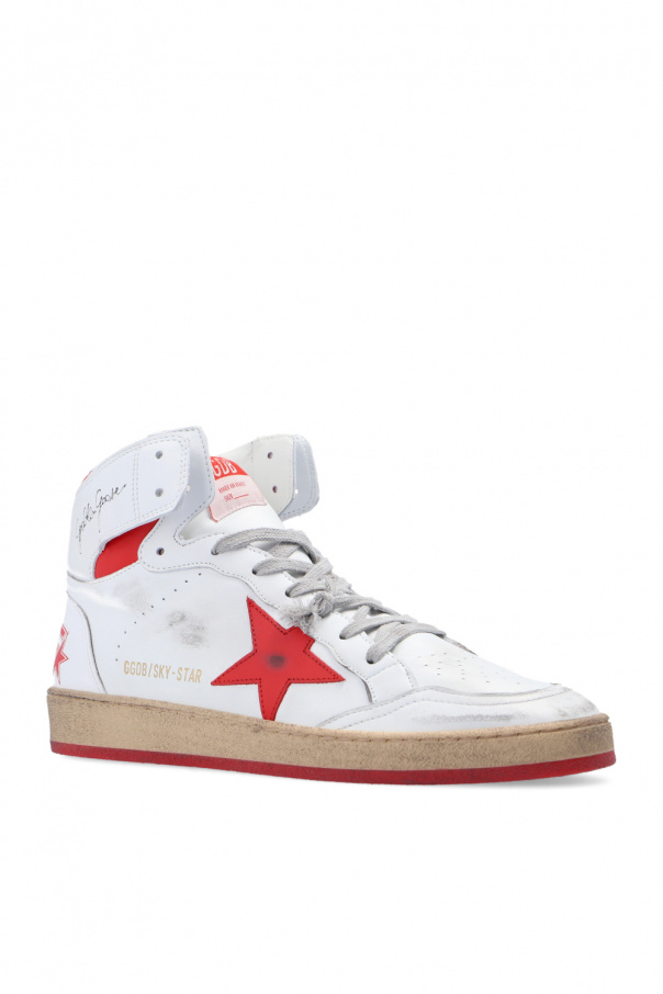 White ‘Sky Star’ high-top sneakers with a vintage effect from Golden Goose. Made of leather, this lace-up pair features perforations, star patch, red insert, gold-tone and black logo print as well as a rubber sole in black and beige.
