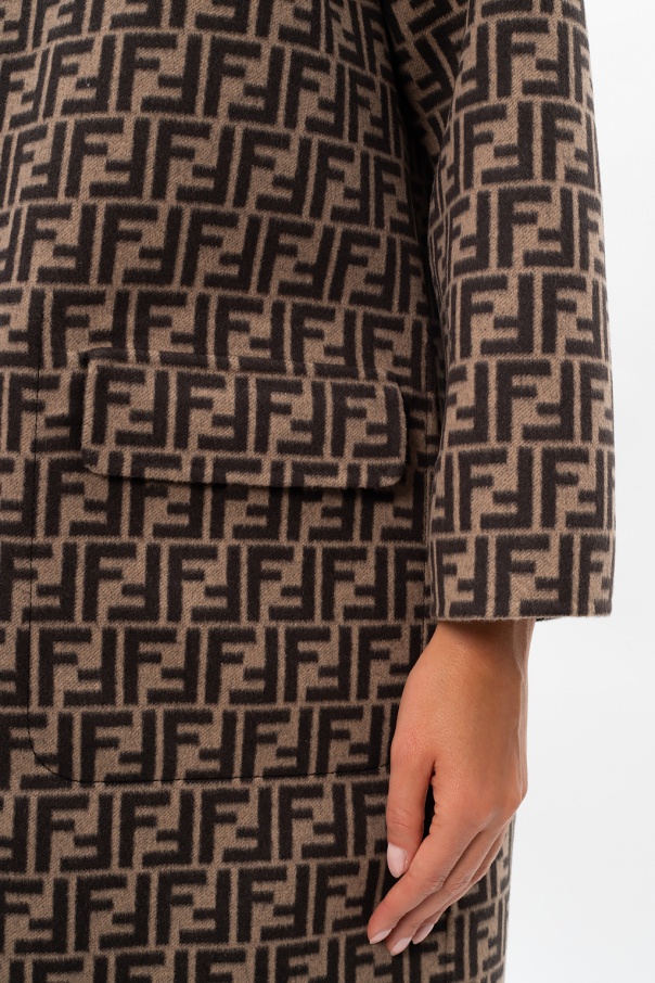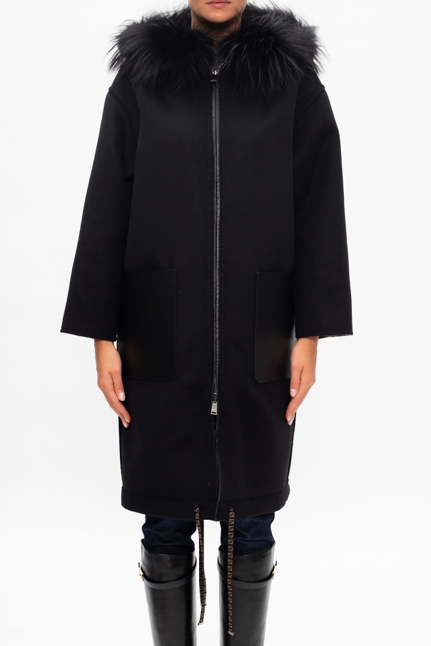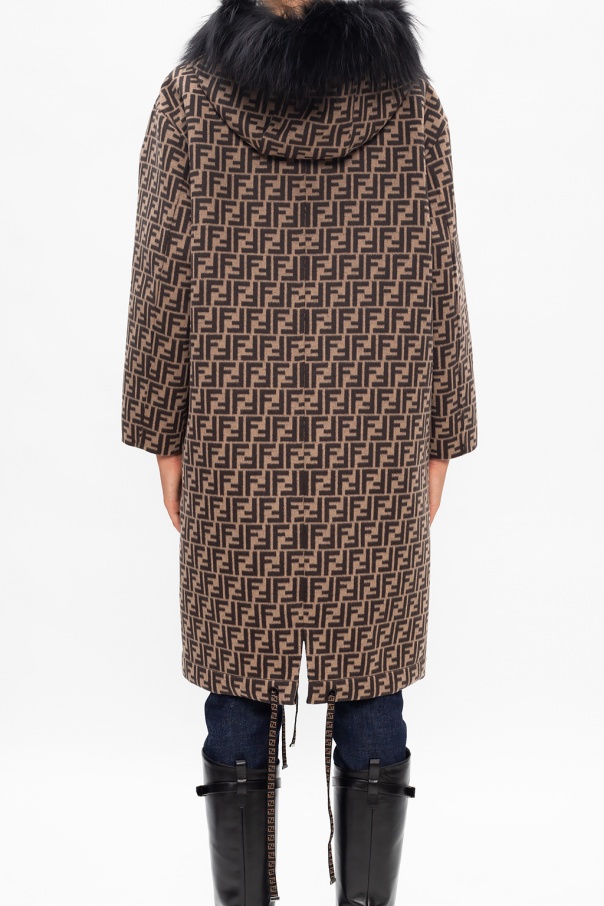 Wool-crafted overcoat from Fendi. Reversible with beige and brown backdrop for signature FF typography pattern on one side and plain black on the reverse, this design is complete with zip fastening, two flapped front pockets, fox fur trims and an elasticated bottom hem.