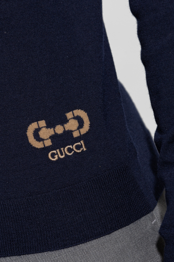 Navy blue crewneck sweater from Gucci. Crafted from wool with a fine knit, this style showcases beige graphic embroidery with the brand's logo and its signature horsebit on the front and ribbed trims on the edges.