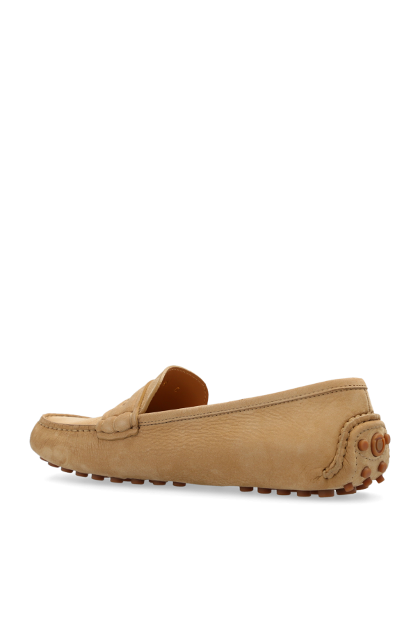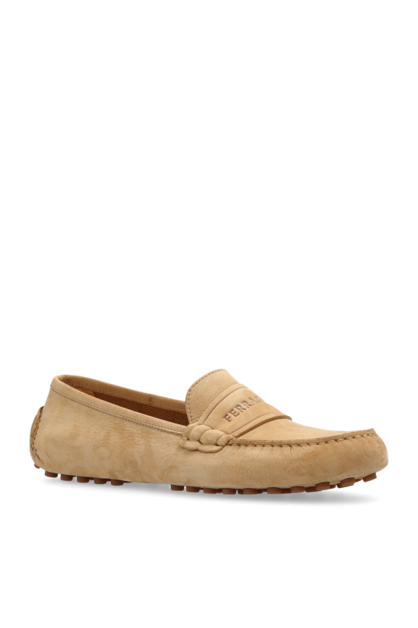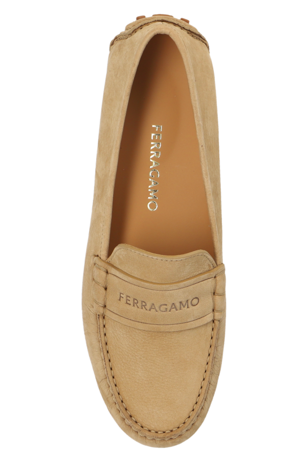 Beige ‘Iside’ moccasins from FERRAGAMO. Made of calf suede, this pair features a logo detail, brown rubber outsole and standard width insole.