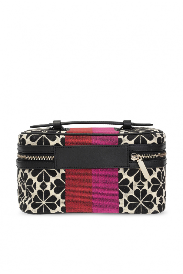 Black and cream wash bag from Kate Spade. Finished with black cow leather, this design showcases a floral jacquard pattern and a red and pink stripe. It is complete with a zip fastening, a gold-tone plaque on the front, a half-round handle and one internal compartment with one slip pocket and one zipped pocket.