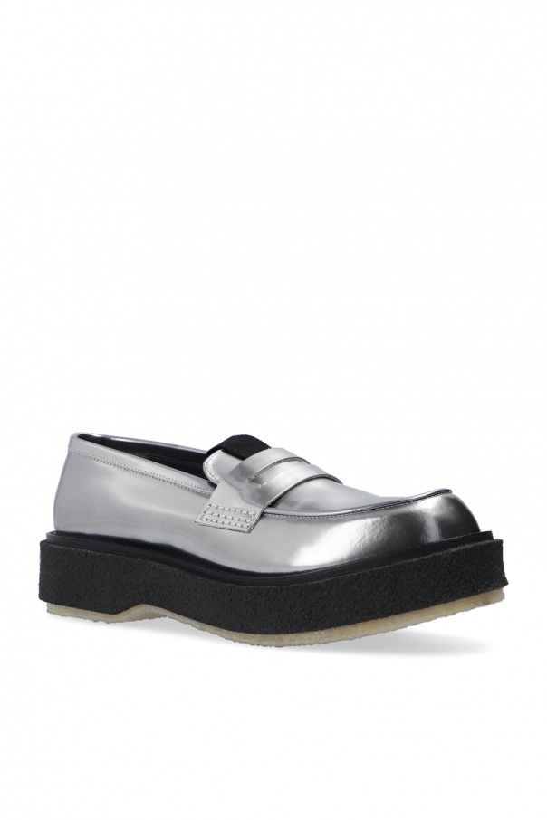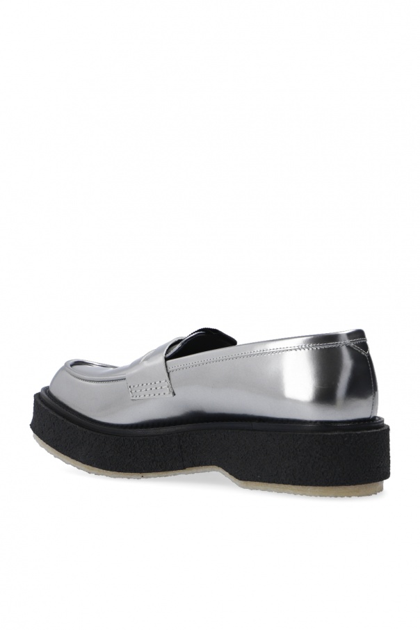Silver-tone ‘Type 143’ platform shoes from Adieu Paris. Made of leather, this pair features a logo print, grosgrain strap and a rubber sole in black and white.