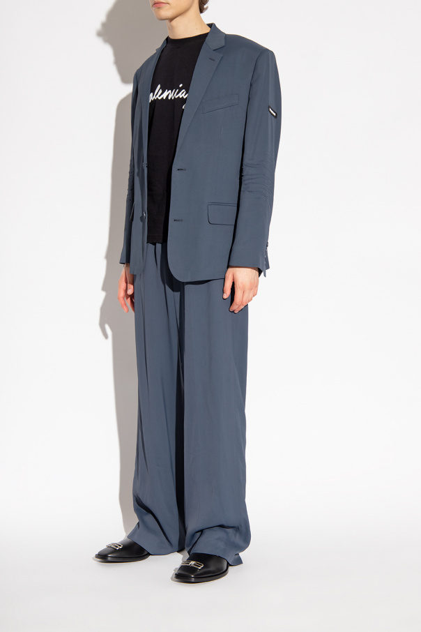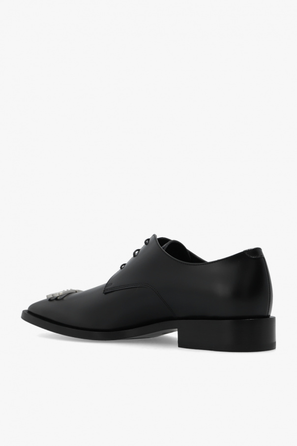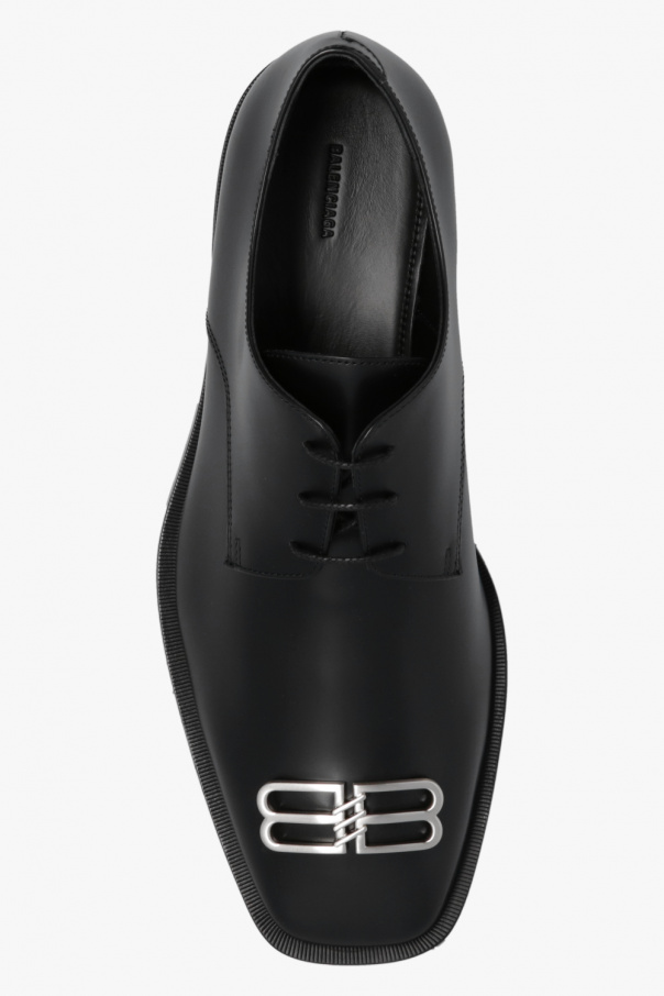 Black Derby shoes from Balenciaga. Crafted from calf leather, this lace-up model sits on a black sole in rubber and leather and showcases antiqued silver-tone ‘BB Icon’ hardware on the front.