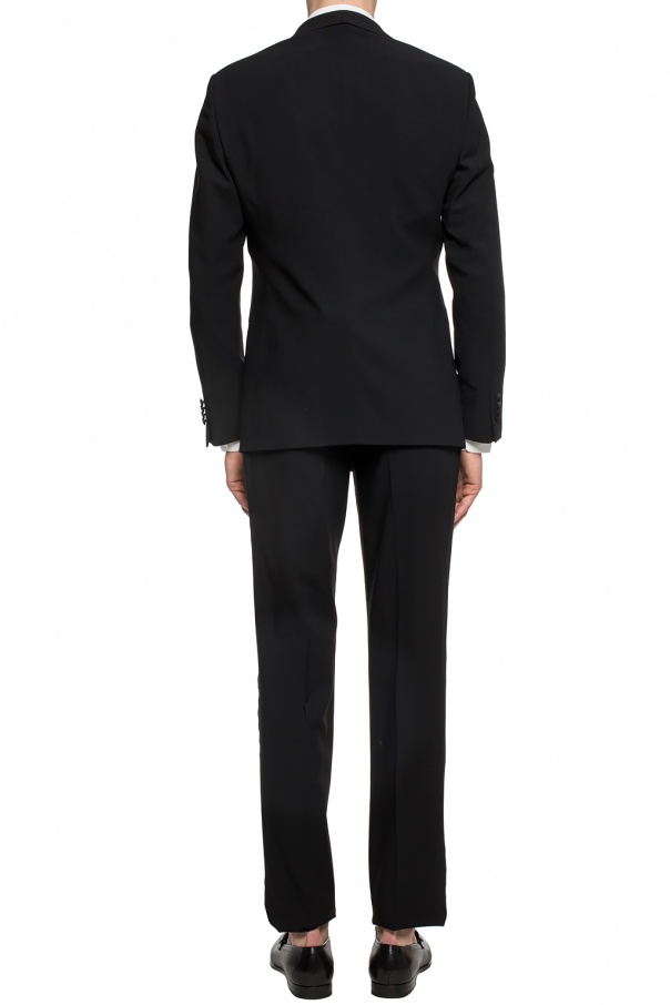 Black suit from Giorgio Armani. Made of wool. Blazer with notch lapels and button fastening. 3 pockets on the front. Silk lining. Creased trousers fastened with a zip and hooks. Decorated with side stripes in the form of black grosgrain stripes. Two slip pockets on the front, two button pockets at the back.