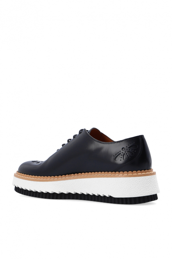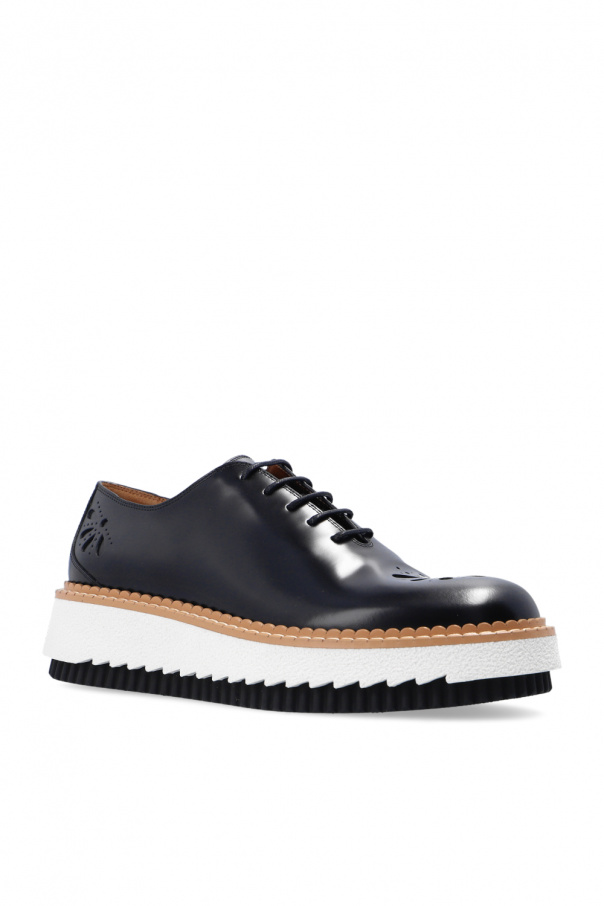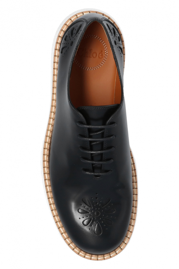 Black ‘Kurtys’ leather shoes from Chloé. Made of patent calf leather, this model showcases an openwork floral design and a three-layered rubber sole in white, light brown and black.