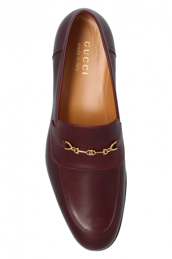 Maroon moccasins from Gucci. Made of leather, this pair features a metal appliqué in gold-tone and leather sole in beige and black.
