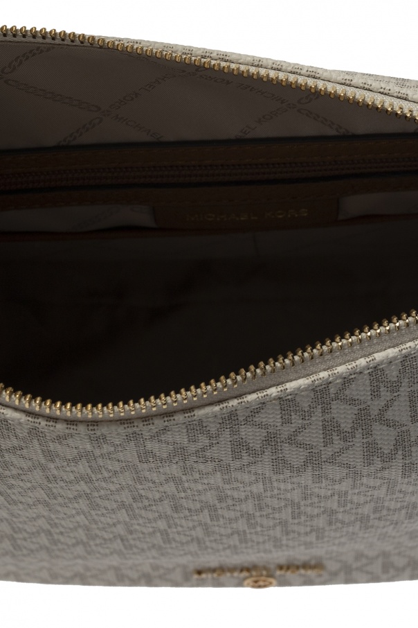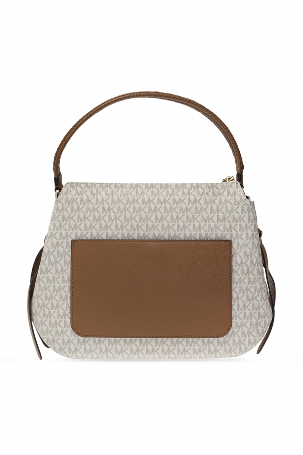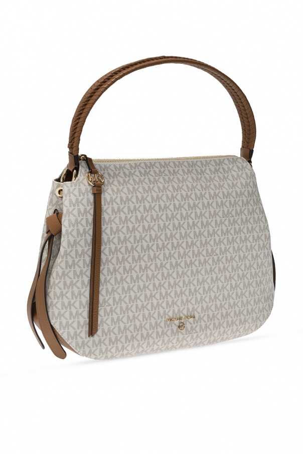 White and brown ‘Grand’ handbag from Michael Michael Kors. Crafted from canvas, this design fastens via a zip and features a metal logo plaque on the front, a pocket with magnetic closure on the back, a half-round handle, gold-tone metal hardware and one internal compartment with a zip pocket and five slip pockets.