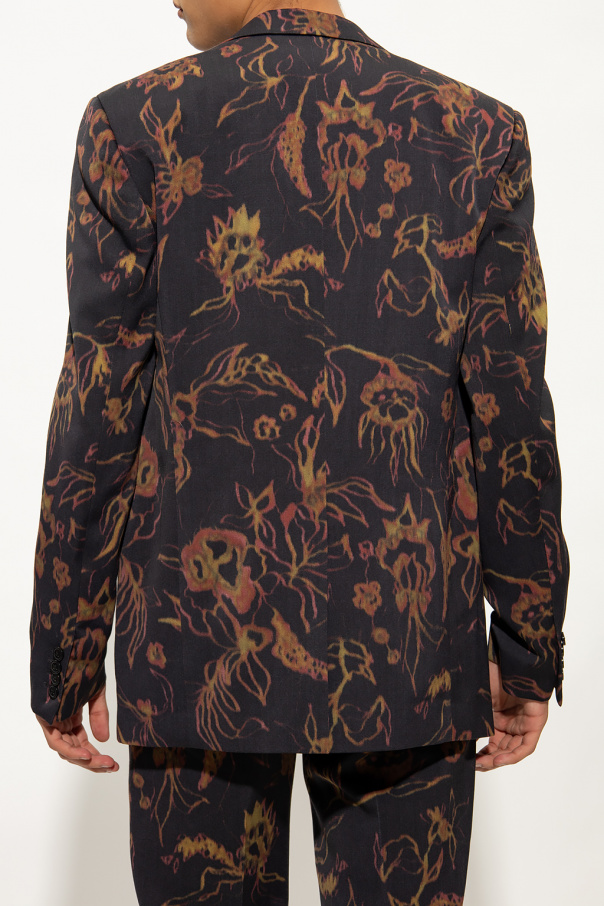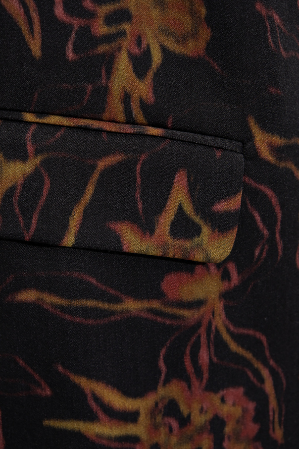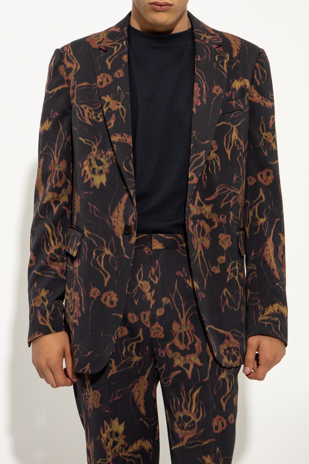 Black blazer from Dries Van Noten. Crafted from wool, this style showcases a brown and red floral pattern, a single button fastening, notch lapels, one slip pocket, two flapped pockets, a single back vent and long sleeves with button cuffs.