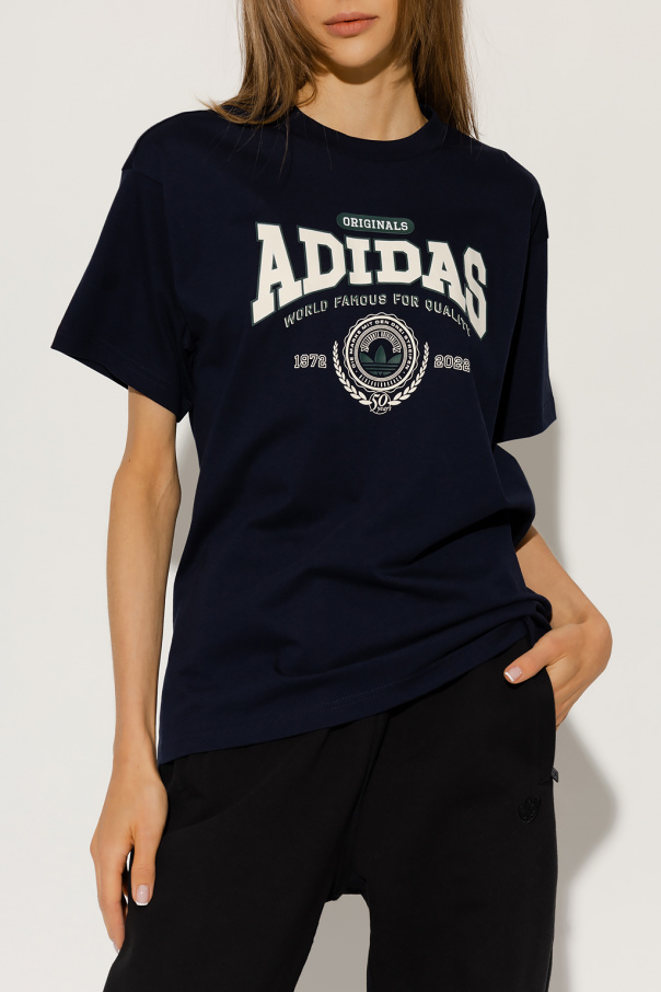 Navy loose-fitting T-shirt from ADIDAS Originals, the ‘End Plastic Waste’ line. Crafted from cotton with the BCI certificate, this short sleeve features a dark green printed logo pattern, patch celebrating the 50th anniversary of the Trefoil logo and ribbed crew neck.