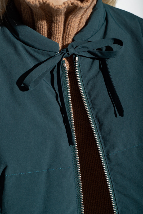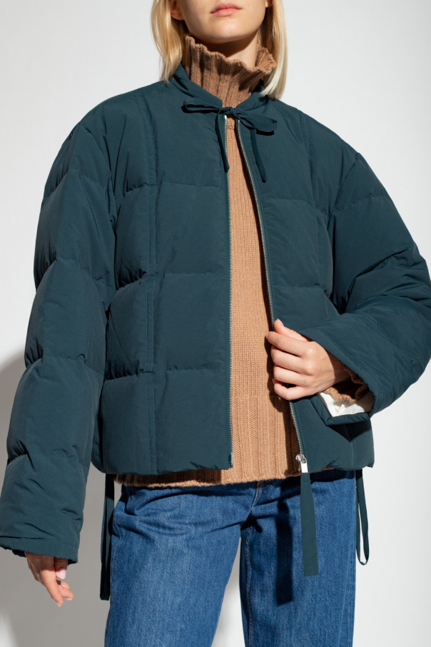 Dark green jacket Jil Sander+. Filled with goose down, this style features a cropped silhouette with a two-way zip fastening, a drawstring stand-up collar, two frontal pockets, a white logo patch on the side, a drawcord-adjustable hem and a white lining.
