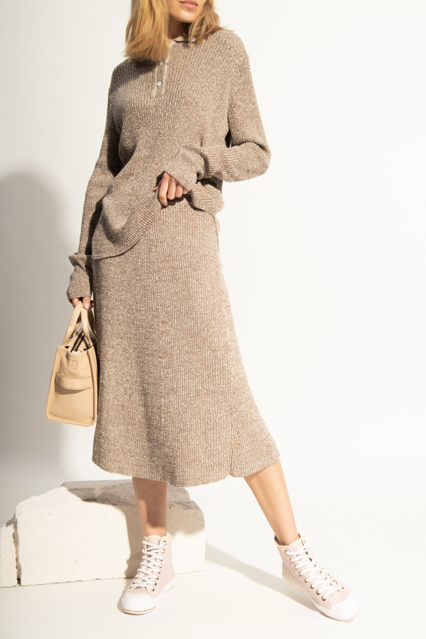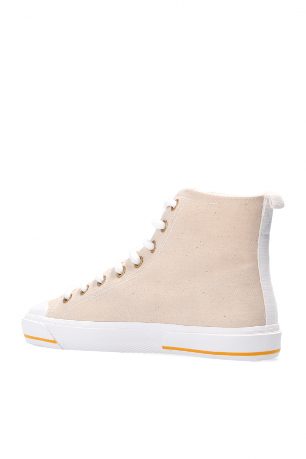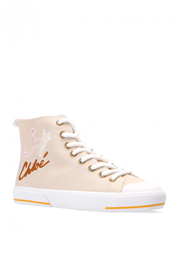 Cream 'Aryana' sneakers from See By Chloé. Crafted from cotton, this lace-up pair sits on a white and orange rubber sole and showcases an embroidered white appliqué and a colourful logo.