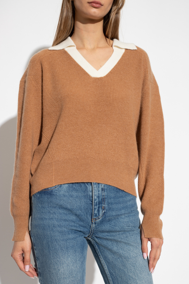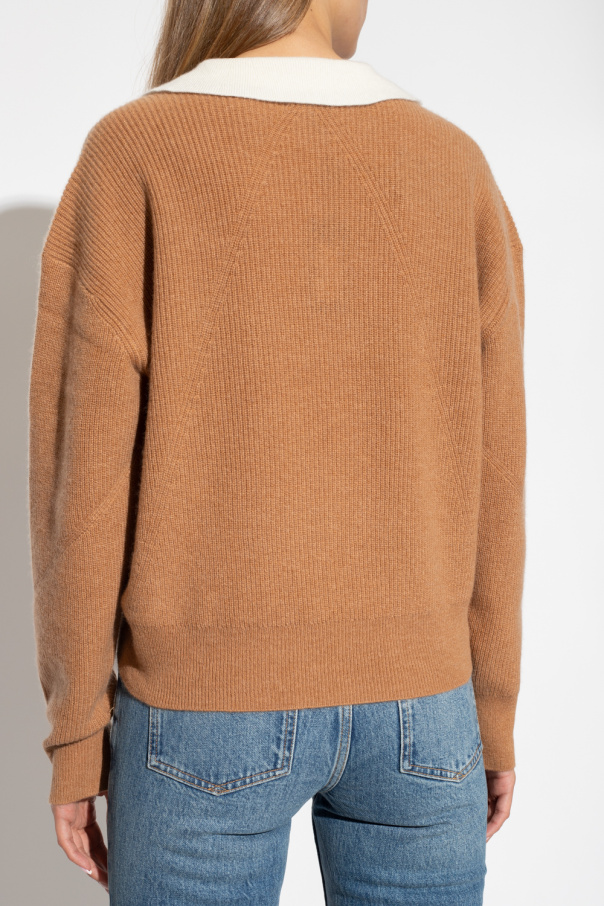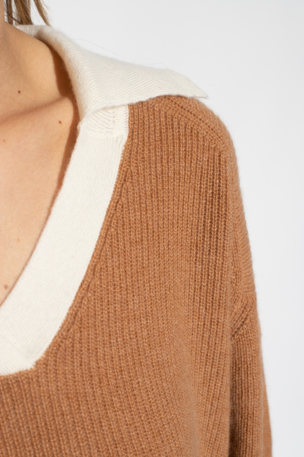 Brown and cream sweater from Rag & Bone. Crafted from cashmere in a rib-knit design, this style features a V-neckline with a collar and long sleeves with slits.